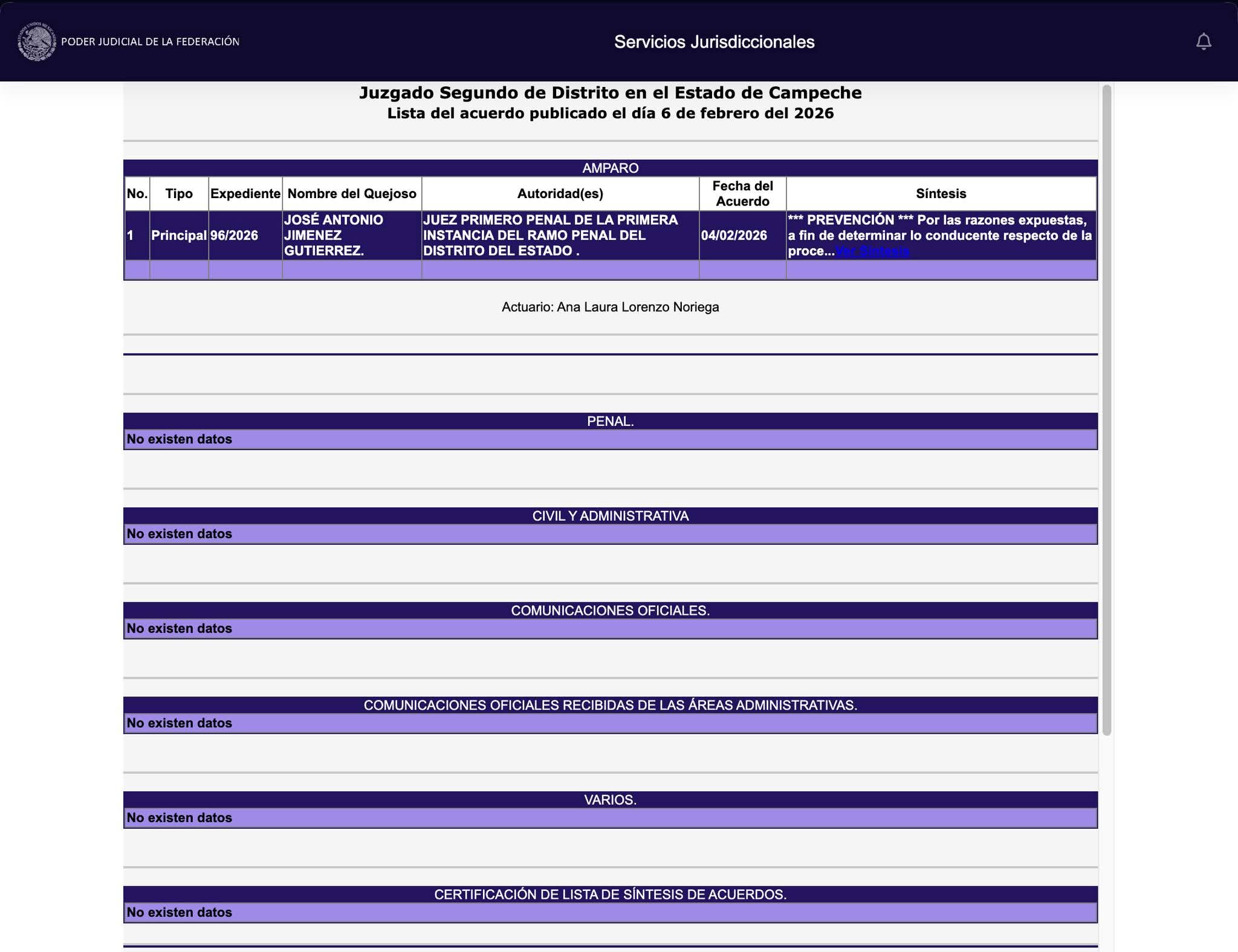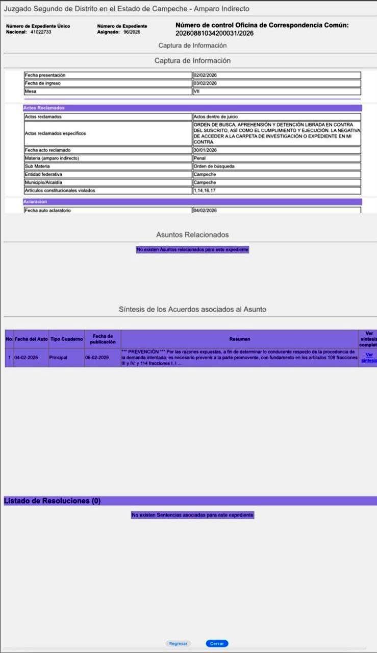 7 de febrero.- El presidente del Congreso del Estado de Campeche, José Antonio Jiménez Gutiérrez, promovió un juicio de amparo ante la sospecha de que pudieran existir órdenes de aprehensión o detención en su contra, lo que atribuye a una estrategia de persecución política, hostigamiento y presión institucional desde el Gobierno del Estado que encabeza Layda Sansores San Román.