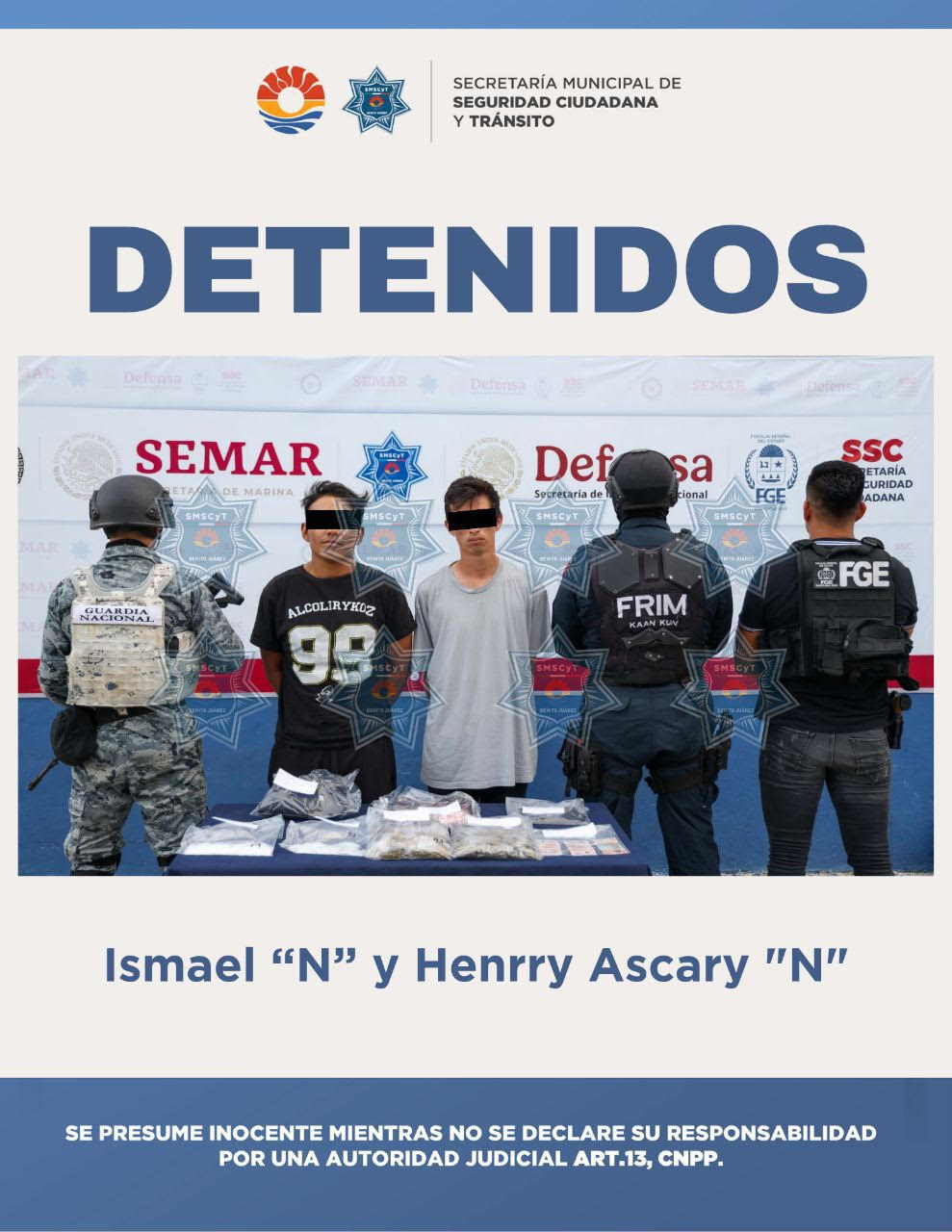 Cancún, 16 de octubre. – La Secretaría Municipal de Seguridad Ciudadana y Tránsito (SMSCyT) de Benito Juárez, en colaboración con la Fiscalía General del Estado y fuerzas federales, logró la detención de dos hombres por su presunta participación en delitos contra la salud, específicamente narcomenudeo.