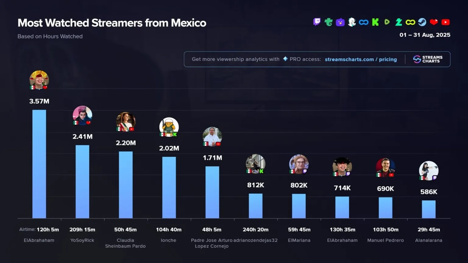 Además, su desempeño destaca por la eficiencia de sus transmisiones. En promedio, cada hora en vivo de Sheinbaum generó 43 mil horas vistas por millón de reproducciones, una cifra superior a la de otros streamers con más volumen de horas transmitidas. En agosto, transmitió 50.8 horas, acumulando 2.20 millones de horas vistas.