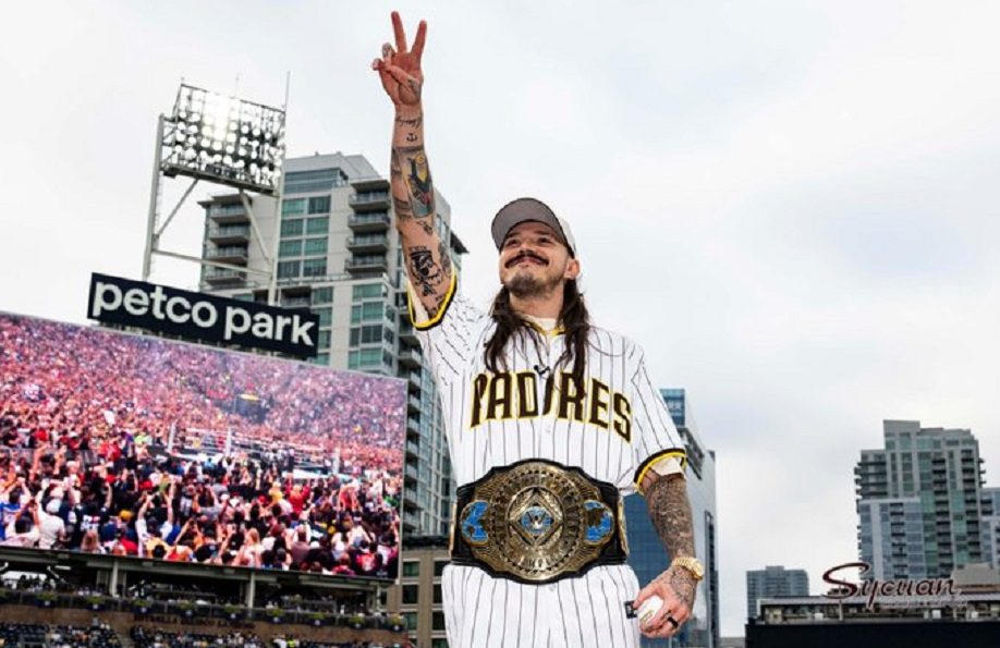 El hijo de Rey Mysterio, oriundo de San Diego, protagonizó una tarde de beisbol en las Mayores, donde presumió su título intercontinental.