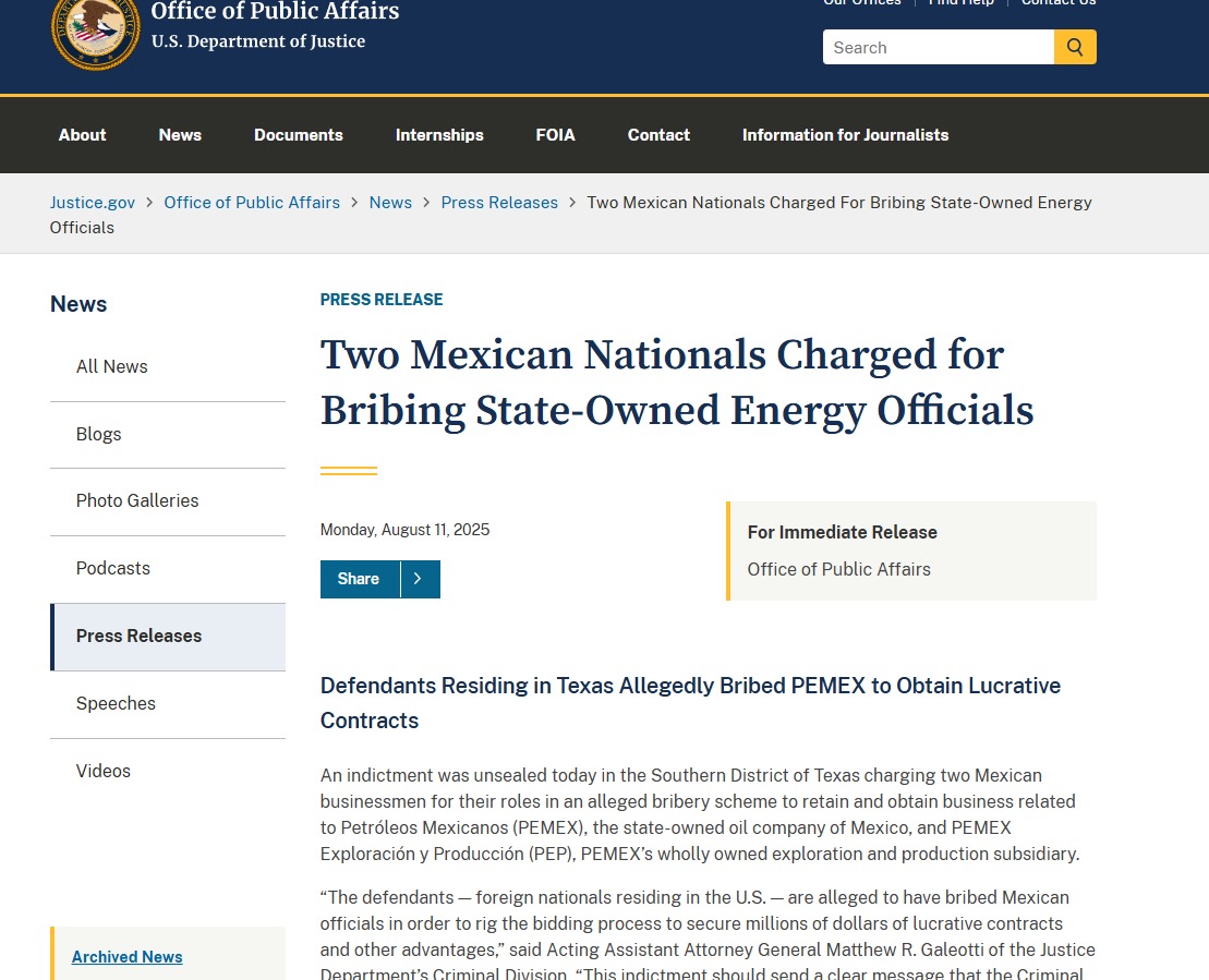 “Se alega que los acusados —ciudadanos extranjeros que residen en EE. UU.— sobornaron a funcionarios mexicanos con el fin de manipular el proceso de licitación y asegurar millones de dólares en contratos lucrativos y otras ventajas”, dijo Matthew R. Galeotti, Fiscal General Adjunto Interino de la División Criminal del Departamento de Justicia. “Esta acusación debería enviar un mensaje claro de que la División Criminal no tolerará a quienes enriquecen a funcionarios corruptos para beneficio personal y en detrimento de la competencia justa.”