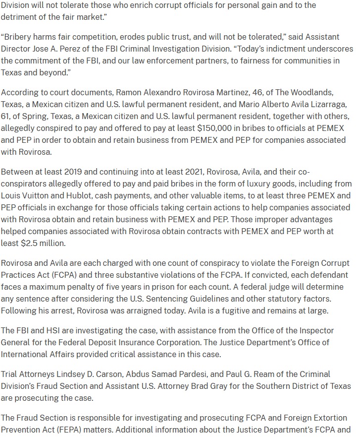 Según documentos judiciales, Ramón Alexandro Rovirosa Martínez, de 46 años, de The Woodlands, Texas, ciudadano mexicano y residente legal permanente en EE. UU., y Mario Alberto Ávila Lizárraga, de 61 años, de Spring, Texas, ciudadano mexicano y residente legal permanente en EE. UU., junto con otros, presuntamente conspiraron para pagar y ofrecieron pagar al menos 150,000 dólares en sobornos a funcionarios de PEMEX y PEP con el fin de obtener y retener negocios de PEMEX y PEP para empresas asociadas con Rovirosa.