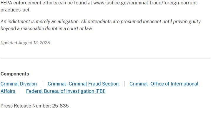 Ambos enfrentan un cargo de conspiración para violar la Ley de Prácticas Corruptas en el Extranjero (FCPA) y tres violaciones sustantivas a la misma ley, con penas de hasta cinco años de prisión por cada cargo.