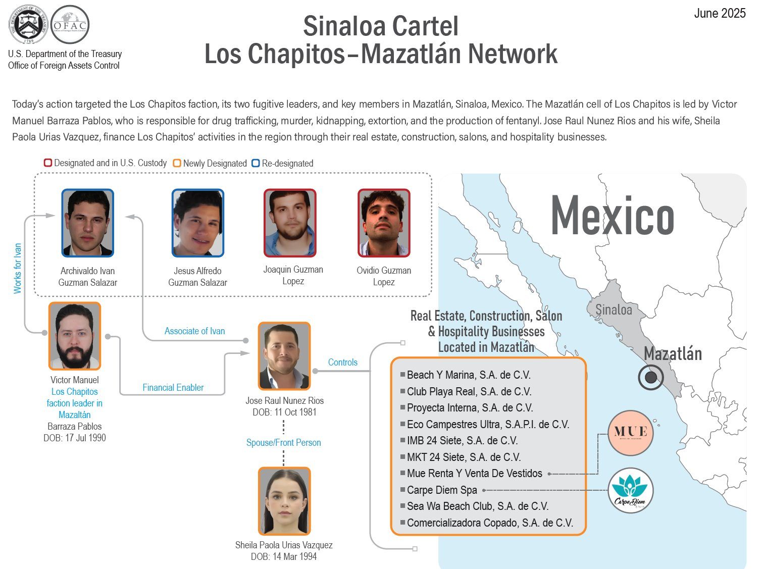 Entre los señalados se encuentra Víctor Manuel Barraza Pablos, presunto jefe de plaza de Los Chapitos en Mazatlán. También fue sancionado el empresario José Raúl Núñez Ríos, a quien se le atribuye el financiamiento de las operaciones del grupo en la región a través de empresas de bienes raíces, construcción y hospitalidad. Según OFAC, Núñez utiliza a su esposa, Sheila Paola Urias Vázquez, como propietaria nominal de varias de estas empresas.