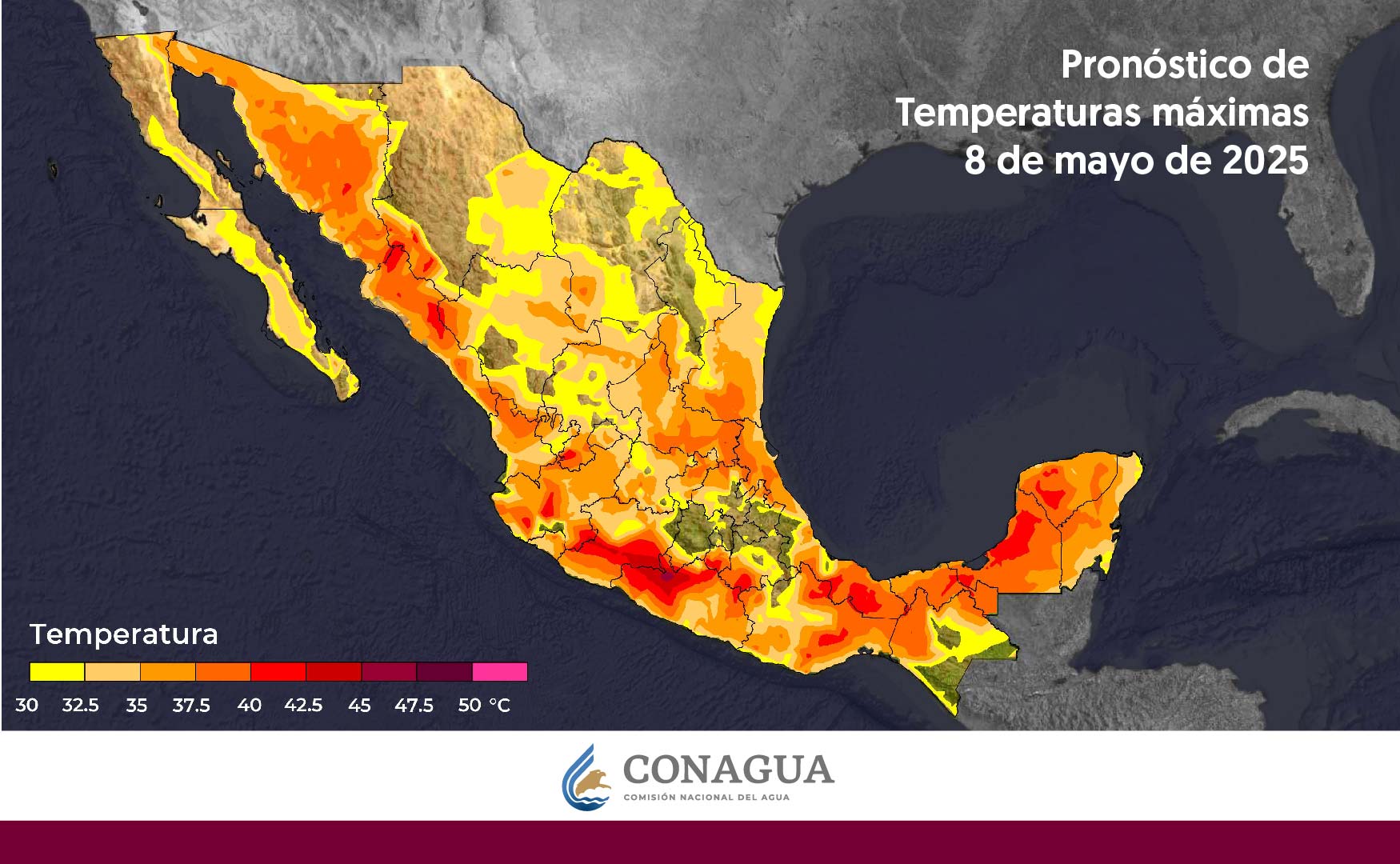 En resumen, los estados del Golfo y sureste reportan los valores más altos (40°C o más), mientras el centro-largo de la República varía de 35 a 40°C, estas cifras superan los promedios típicos de primavera en dichas regiones.