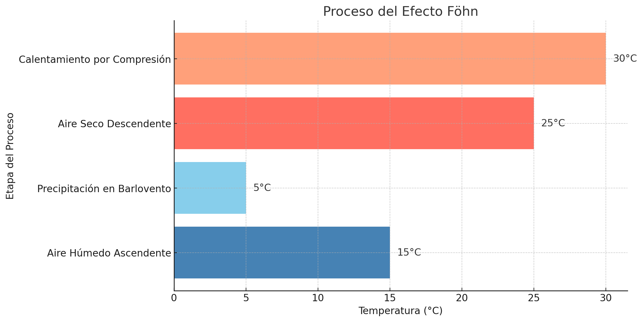 El efecto Föhn es un fenómeno meteorológico clásico en zonas montañosas: cuando el aire húmedo asciende por el lado de barlovento de una sierra, se enfría y precipita humedad; al descender por el lado opuesto, el aire se comprime, se seca y se calienta rápidamente.