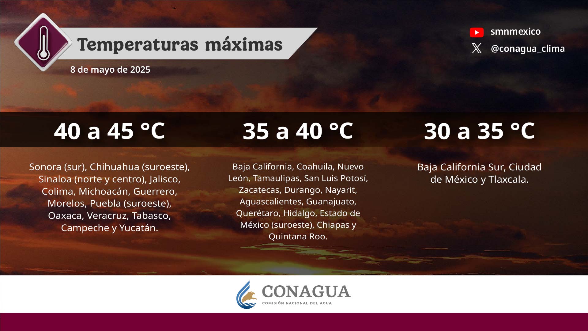 El Servicio Meteorológico Nacional (SMN) y la Conagua han emitido comunicados sobre el calor, en sus boletines se menciona la circulación anticiclónica y se confirma la onda de calor en al menos 21 entidades.
