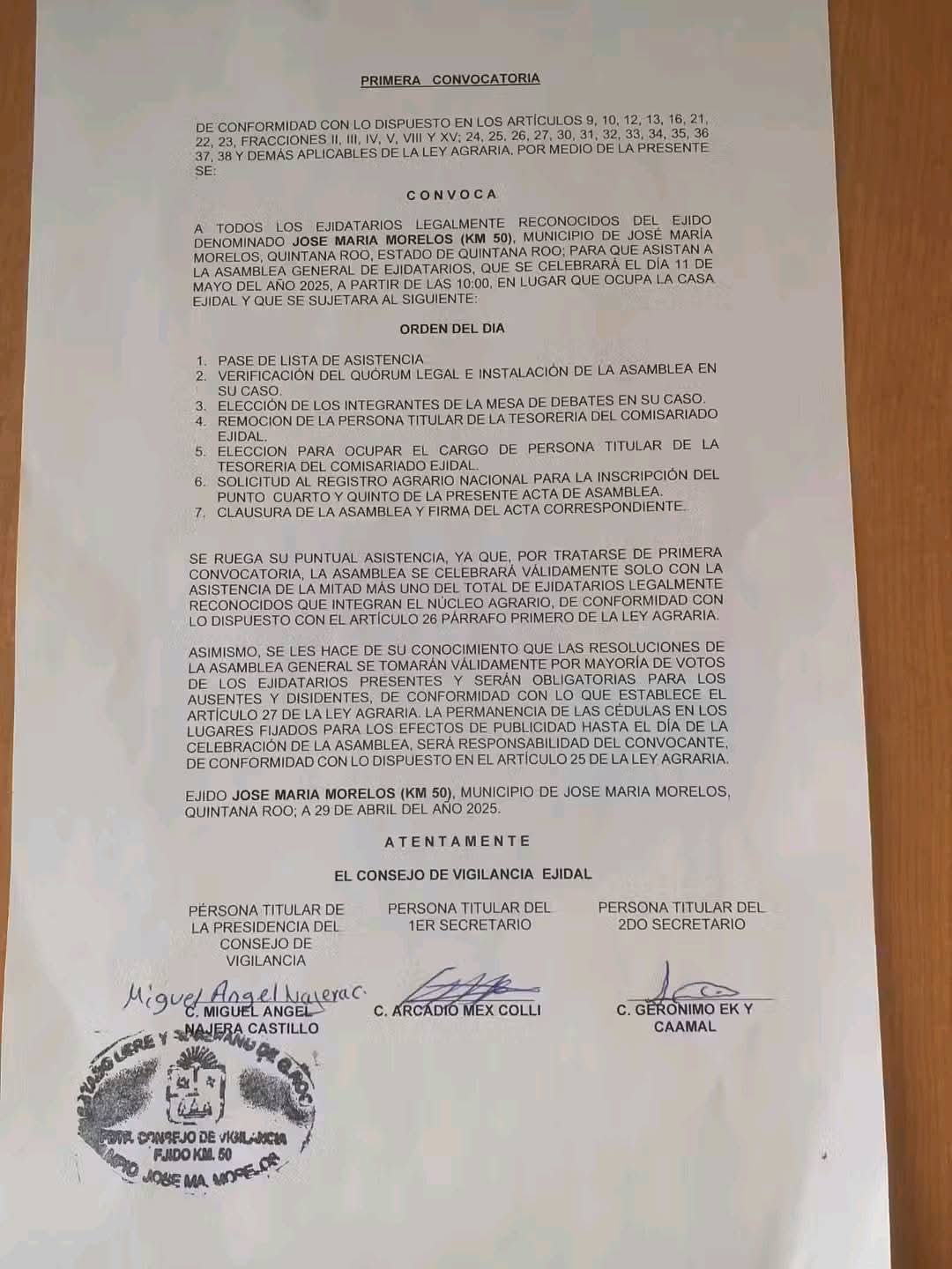 La convocatoria fue firmada el 29 de abril de 2025 por el Consejo de Vigilancia Ejidal y circula ya en medios oficiales del ejido. Se espera que la asamblea del 11 de mayo sea clave para definir el rumbo de la actual administración ejidal.