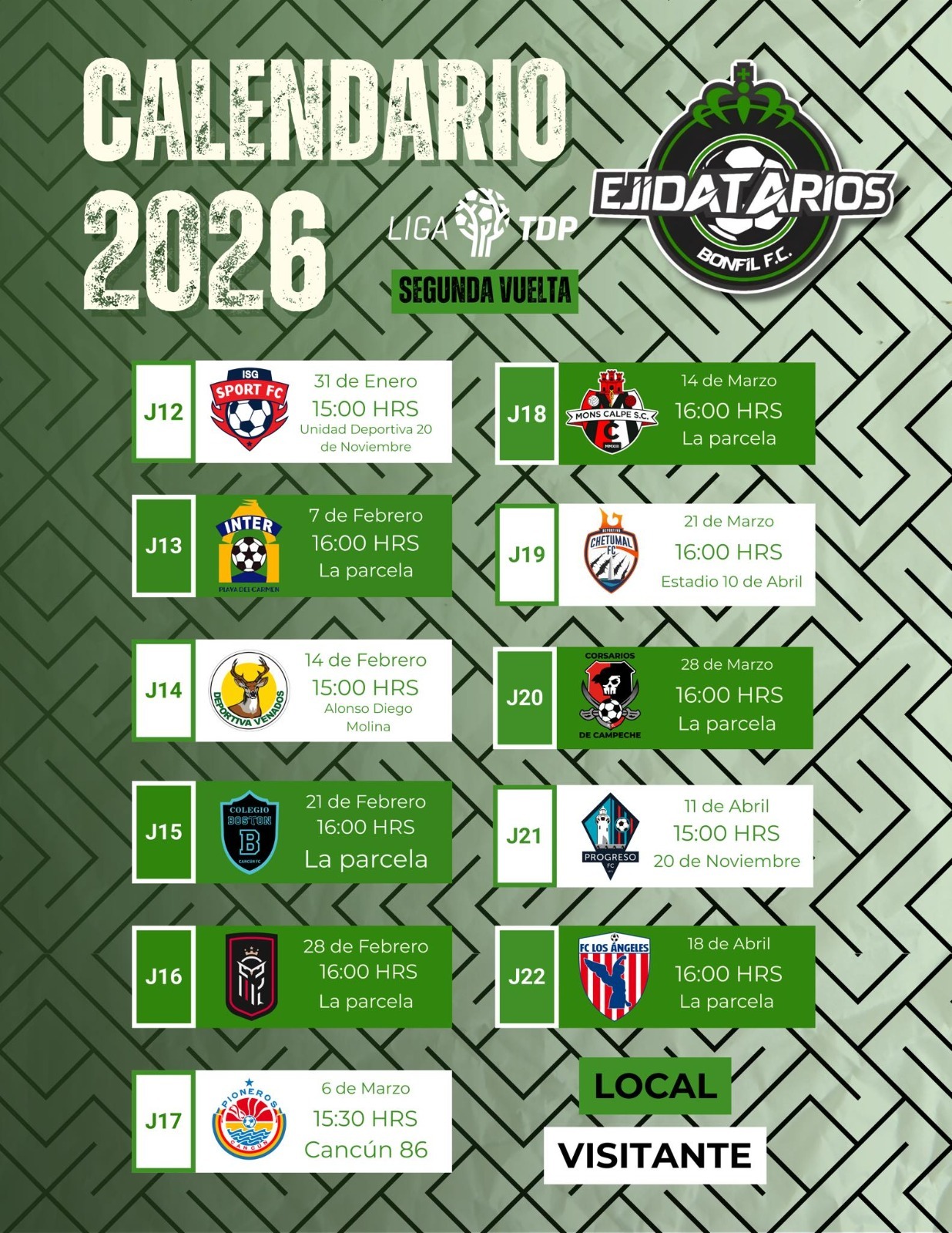 Por lo pronto la directiva de los Ejidatarios de Bonfil FC, confirmó la fecha y horarios para sus compromisos de la segunda vuelta del Torneo 2025-26 del Grupo Uno en la Liga TDP, misma que para ellos dará comienzo el sábado 31 de enero visitando al ISG Sport Futbol Club en Ciudad del Carmen, Campeche; mientras que su regreso a la cancha de “La Parcela”, será el 7 de febrero recibiendo al Inter Playa.