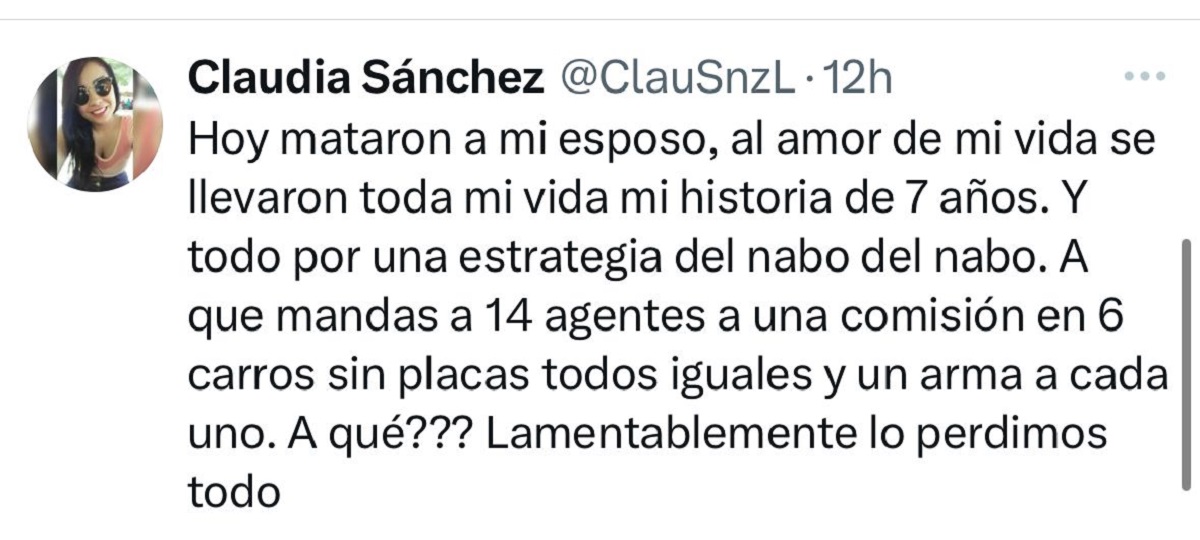 “Hoy mataron a mi esposo, el amor de mi vida se llevaron mi historia de 7 años”, lamentó. “Y todo por una estrategia del enabo (sic) que mandas a 14 agentes a una comisión de 6 carros sin placas, todos iguales y un arma en cada uno ¿A qué?”, cuestionó.