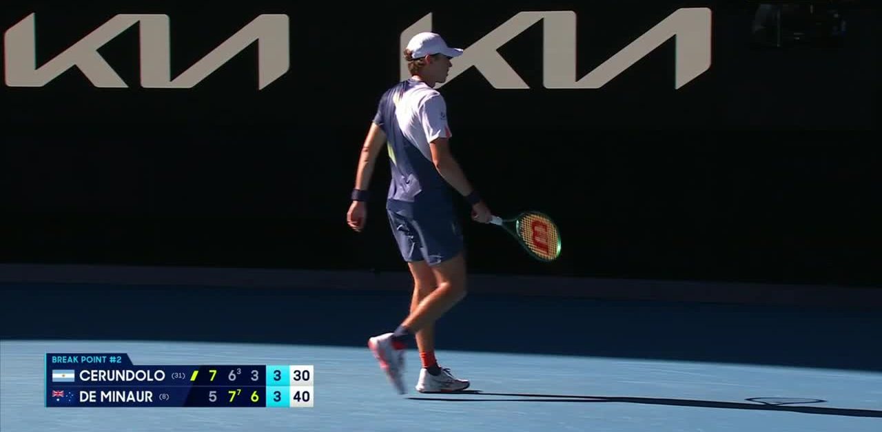 La situación cambió radicalmente en el tercer set, cuando De Miñaur empezó a imponer condiciones y el de Buenos Aires sintió molestias en su pierna izquierda, al punto de que debió recibir atención médica. Los recurrentes errores no forzados de Cerúndolo (17 en este parcial y 92 en total) fueron un aliado fundamental del australiano, que, con dos quiebres a su favor, se adelantó en el marcador.