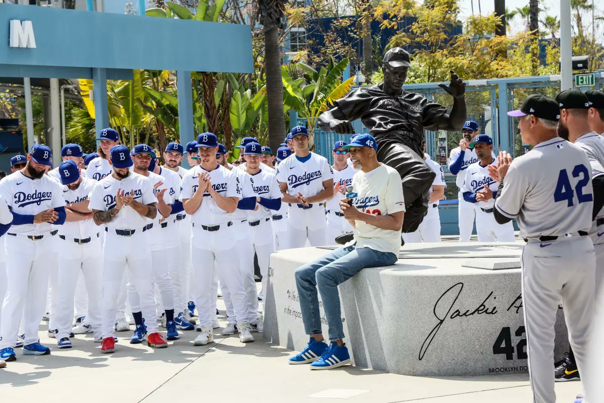 Jugadores y personal de los Dodgers, incluidos Shohei Ohtani, Mookie Betts y el novato Roki Sasaki, así como de los Rockies de Colorado rodearon la estatua de Robinson en Centerfield Plaza horas antes del inicio del juego en Los Ángeles.