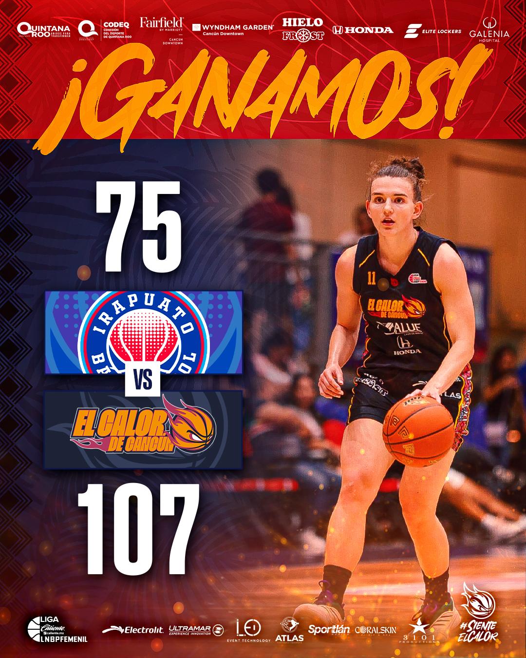 IRAPUATO, GTO. a 12 de mayo.- Con 48 puntos en la primera mitad y otros 59 en la segunda, El Calor de Cancún superó los cien puntos por primera vez en su naciente historia en la Liga Nacional de Baloncesto Profesional Femenil Caliente.Mx (LNBPF), al derrotar 107-75 a las Freseras del Irapuato en el “Inforum” de aquella ciudad guanajuatense, en un juego correspondiente a la tercera miniserie del calendario.