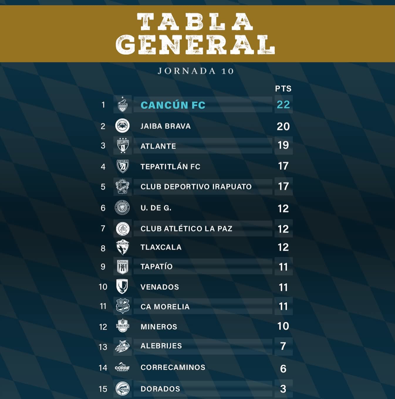 Cabe señalar que el otro conjunto que en este instante se ubica en el -Top Tres- del certamen, es el de los Potros de Hierro del Atlante, y es que a cinco jornadas de concluir el calendario, los cancunenses (22) aventajan por dos puntos a los tampiqueños (20) y por tres a los atlantistas (19).
