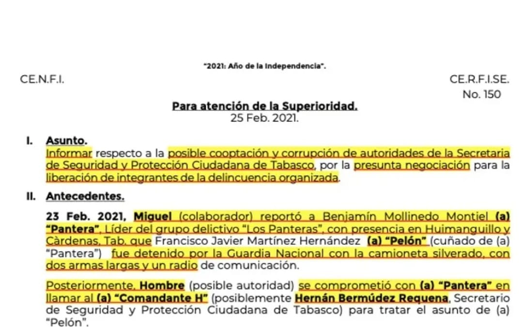 La Secretaría de Defensa, la de Marina y también el Centro Nacional de Inteligencia son quienes proveen información al Cerfi. El 13 de diciembre de 2020, a raíz del seguimiento a integrantes del Cartel de Jalisco Nueva Generación, se obtuvo la comunicación entre Taca y Joncha, dos integrantes del cártel dedicados al trasiego de hidrocarburo en Cárdenas. “Se conoció que el responsable de la ejecución de Andrés Rodríguez Vasconcelos, Kalimba, fue Benjamín Mollinedo, Pantera, con apoyo de los oficiales por órdenes del Gobernador (quizá se refieran a Adán Augusto López Hernández, Gobernador de Tabasco)“, escribe el Cerfi.