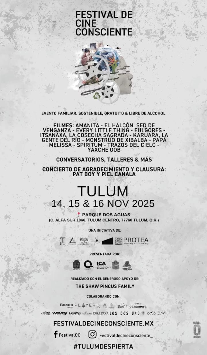 TULUM a 10 de noviembre .— Convertido ya en uno de los eventos culturales más esperados del año, el Festival de Cine Consciente celebrará su séptima edición del 14 al 16 de noviembre en el domo de básquetbol del parque Dos Aguas, consolidándose como una plataforma que promueve el diálogo social y ambiental a través del cine. Con un enfoque familiar, gratuito y libre de alcohol, el encuentro busca inspirar una participación activa de la comunidad en torno a temas que trascienden la pantalla.