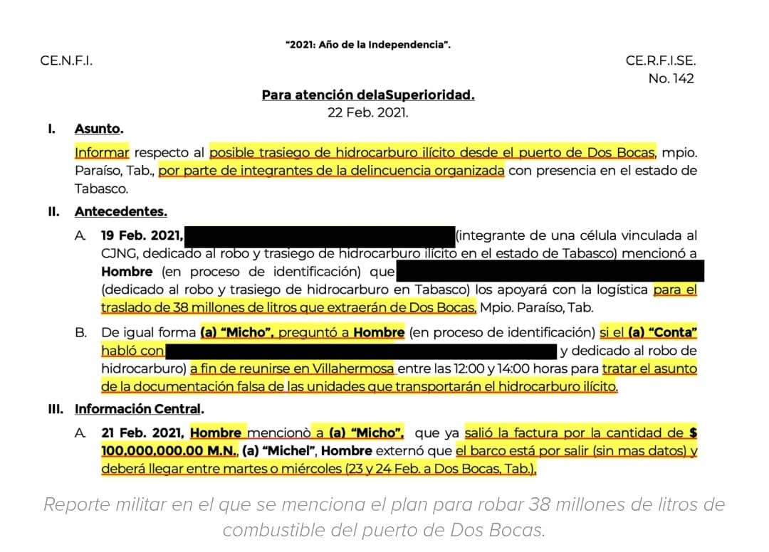Mexicanos Contra la Corrupción y la Impunidad (MCCI) dio a conocer un informe militar fechado en febrero de 2021, en el que se revelaba que un grupo delictivo planeaba extraer 38 millones de litros de combustible de un buque que arribaría al puerto de Dos Bocas.