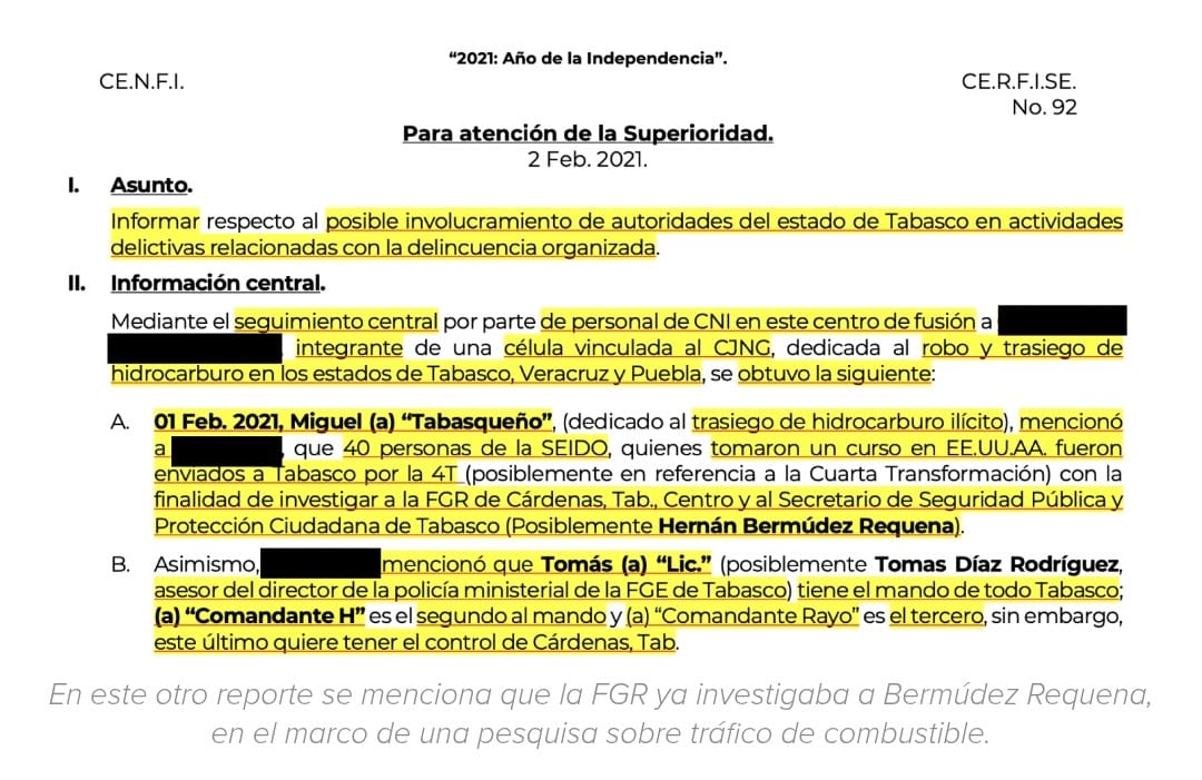 “…que 40 personas de la SEIDO (Subprocuraduría Especializada en Investigación de Delincuencia Organizada), quienes tomaron un curso en Estados Unidos, fueron enviados a Tabasco por la 4T con la finalidad de investigar a la FGR de Cárdenas, Tabasco, Centro y al Secretario de Seguridad Pública Ciudadana de Tabasco (posiblemente Hernán Bermúdez Requena)”, se lee textual en el informe oficial.