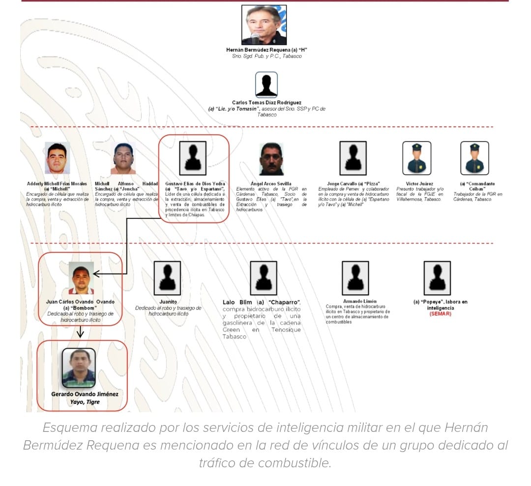 Reportes de inteligencia militar identifican al ex Secretario de Seguridad Pública de Tabasco, Hernán Bermúdez Requena, como cómplice de un grupo criminal que robaba combustible en el puerto de Dos Bocas.