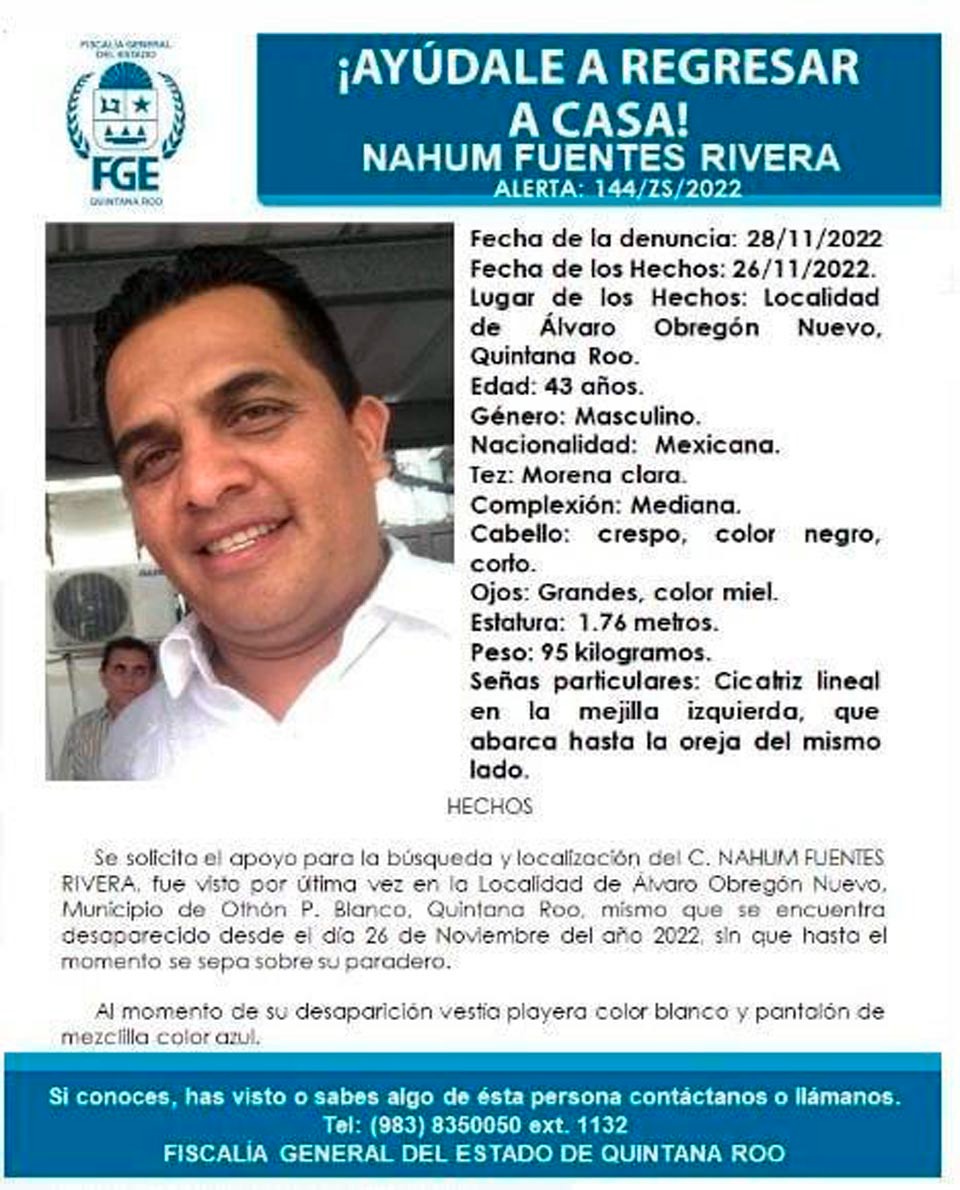 Nahum Fuentes Gutiérrez lleva más de cinco años que lo levantaron en la cercanía al ingenio azucarero Álvaro Obregón en la Rivera del Río Hondo, junto con un funcionario municipal de Felipe Carrillo Puerto.