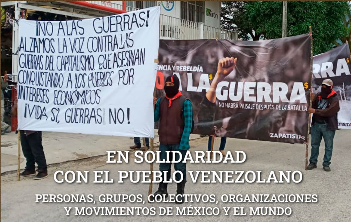En un mensaje difundido en conjunto con otros 306 colectivos, organizaciones y personas, 1el EZLN se solidarizó con el pueblo venezolano frente a la invasión “por parte de tropas Estados Unidos”, y advirtieron que ese país pretende “apoderarse de todo un territorio, como reinicio de las guerras de conquista del Gran Capital”.