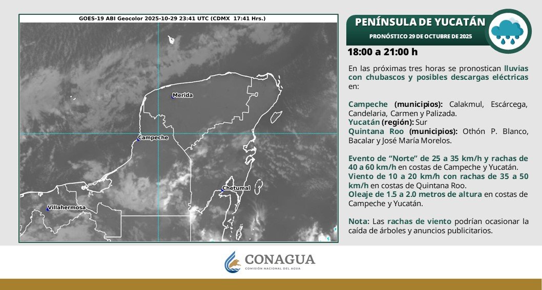 De acuerdo con el Servicio Meteorológico Nacional (SMN), este sistema traerá consigo lluvias moderadas que impactarán entre el 5 y 30 % del territorio de Yucatán, especialmente en las zonas oriente y sur, así como un evento de “norte” con rachas de viento de 30 a 55 km/h, sin descartar picos de hasta 60 km/h.