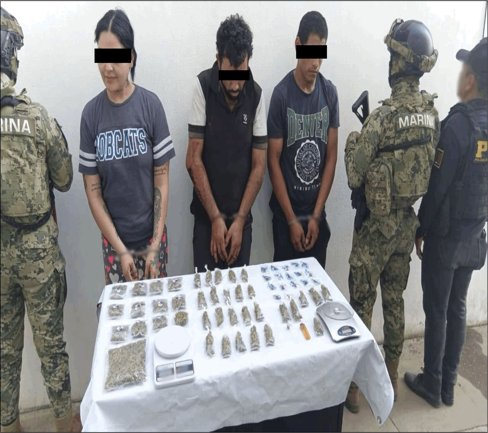 -En Mapastepec, derivado de información de inteligencia, elementos de la Semar, Fiscalía General del Estado y Policía Ministerial realizaron cateos a cinco domicilios, detuvieron a cuatro personas, una de ellas de nacionalidad extranjera, se les aseguraron 39 dosis y 250 gramos de marihuana, 17 dosis de cocaína, un arma corta de fabricación artesanal, tres cartuchos, un vehículo y dos motocicletas.