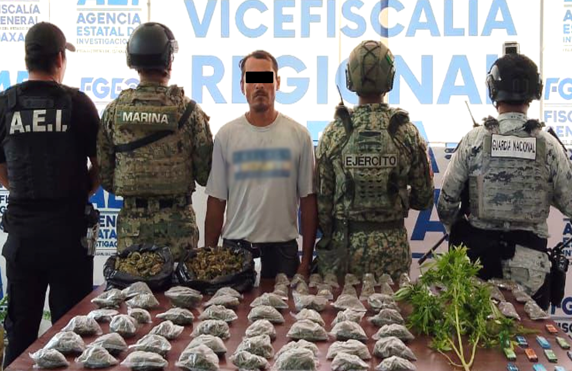 -En Santos Reyes Nopala, elementos de GN, Ejército Mexicano, Semar, Fiscalía y Policía Estatal catearon un inmueble, detuvieron a una persona, aseguraron un arma larga, un kilo de marihuana y 13 paquetes de papel arroz.