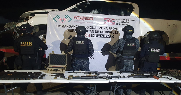 -En Frontera Comalapa, elementos de la Fuerza de Reacción Inmediata PAKAL aseguraron cuatro armas largas, cuatro armas cortas, diversos cargadores y cuatro camionetas, tres de ellas con blindaje.