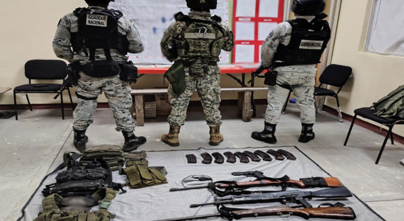 -En Villanueva, elementos de GN y Ejército Mexicano localizaron y aseguraron dos armas largas, 25 cargadores, 730 cartuchos, cuatro chalecos tácticos y ocho placas balísticas.