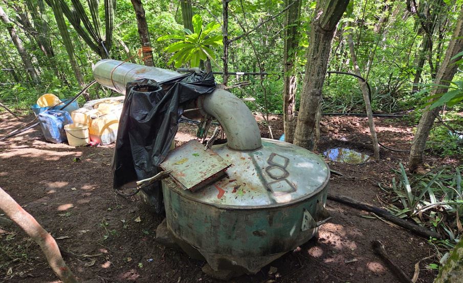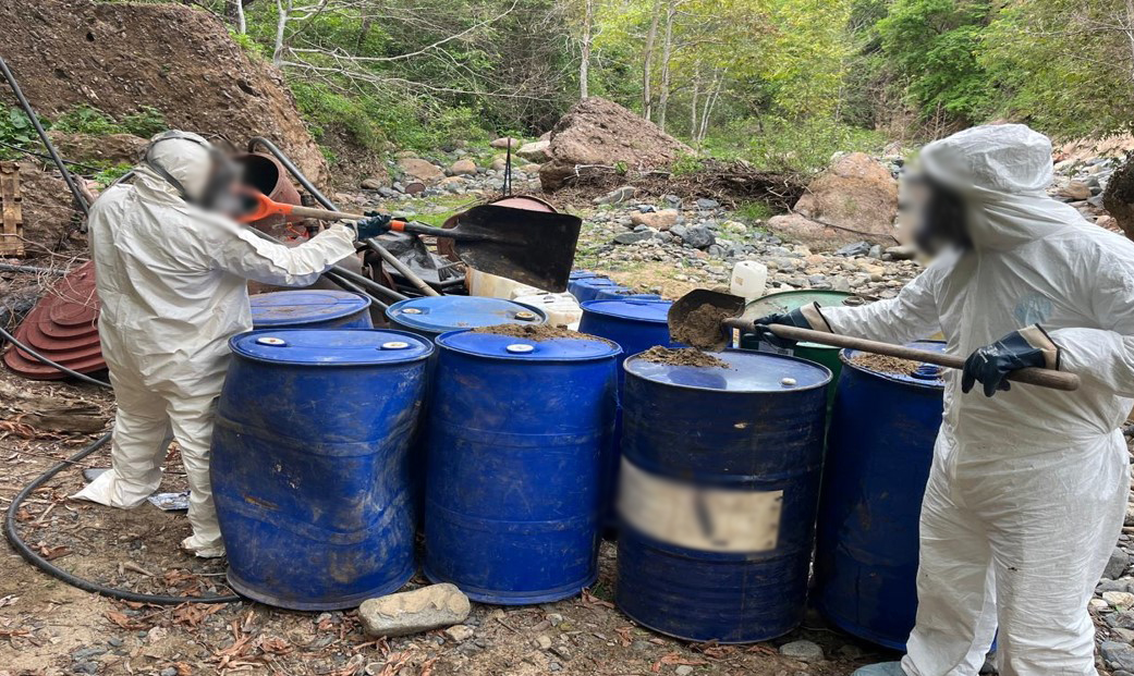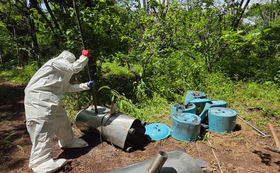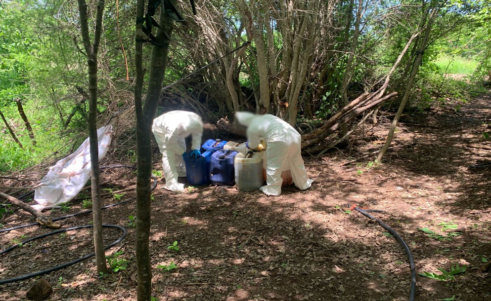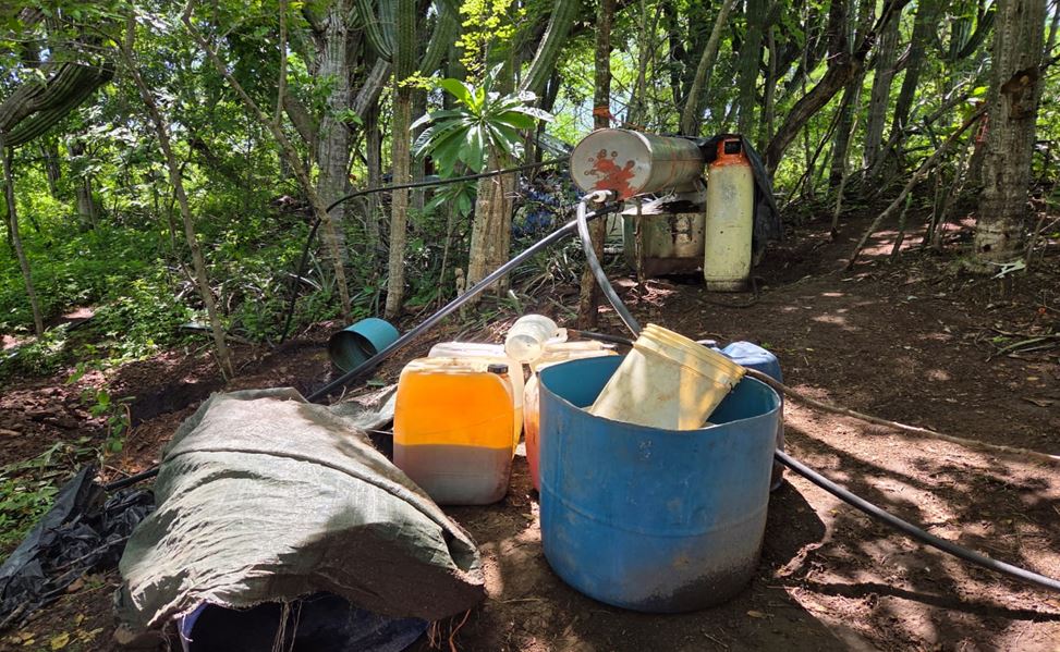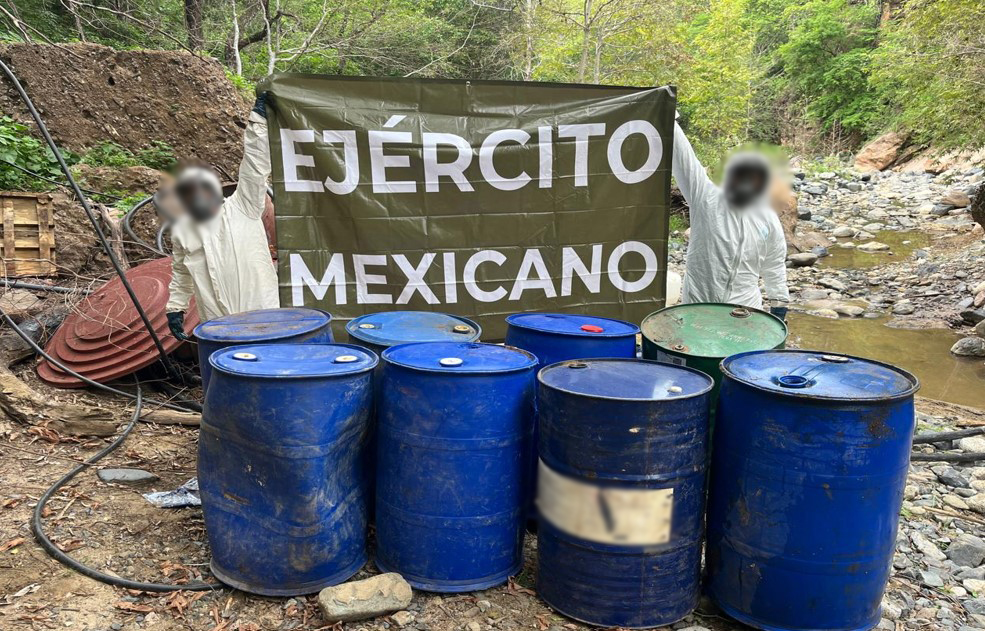 En Chiapas, en el poblado Nueva Esperanza Progresista, elementos del Ejército Mexicano localizaron un laboratorio clandestino para la elaboración de metanfetamina y aseguraron 12,800 litros de sustancias químicas, siete reactores de síntesis orgánica y 13 condensadores.