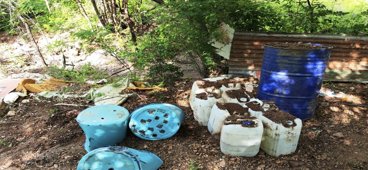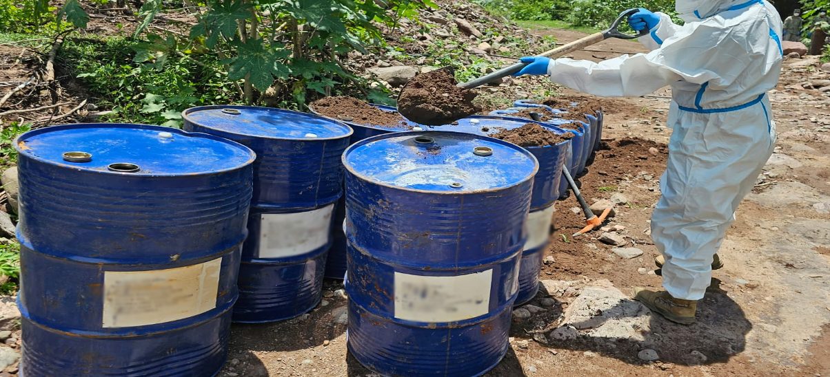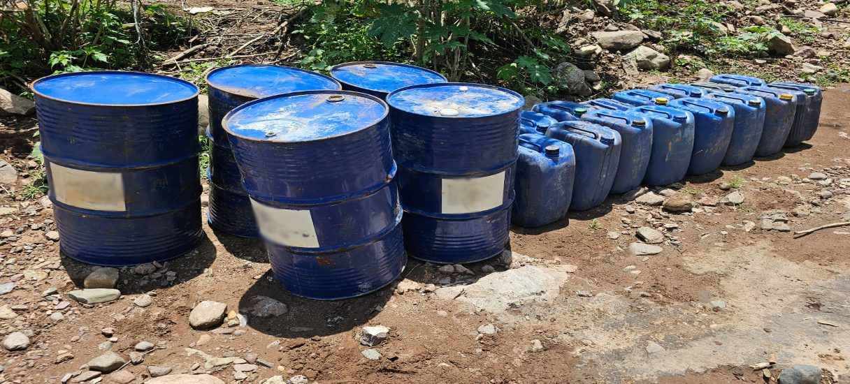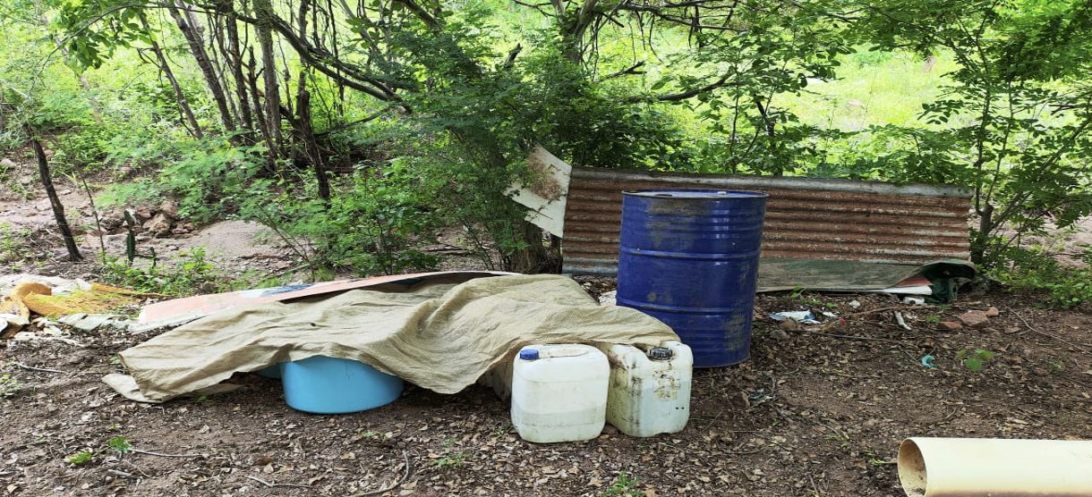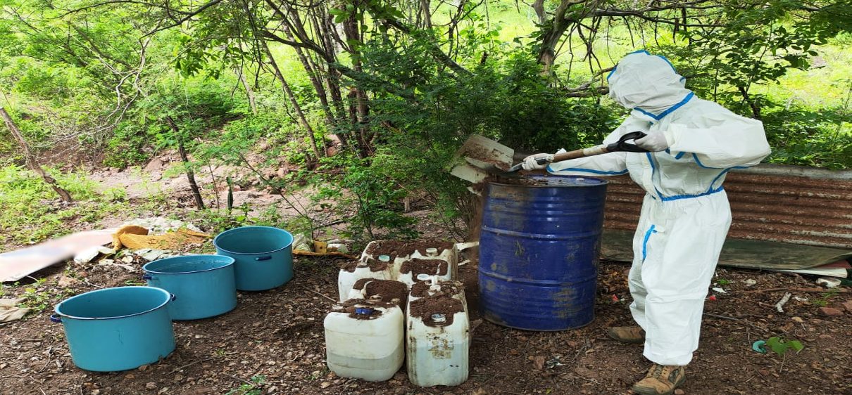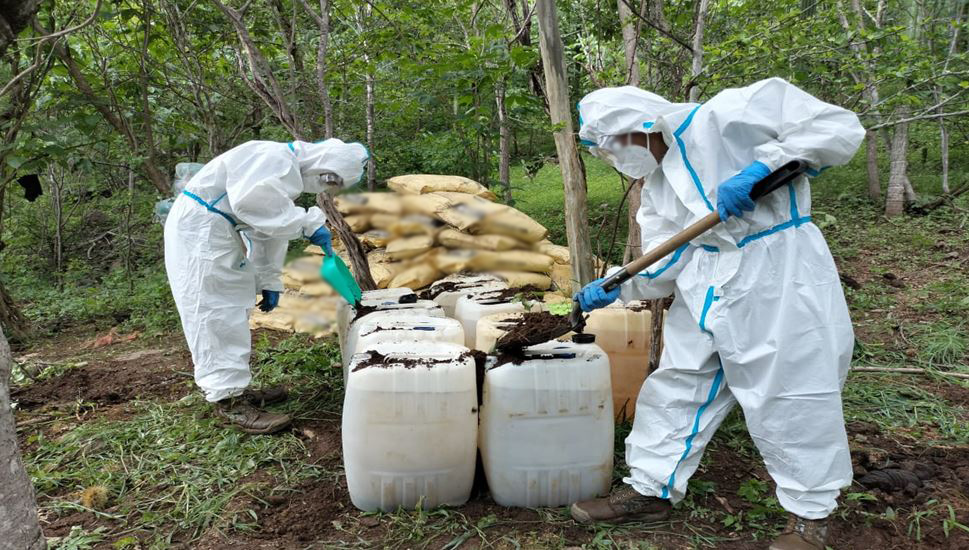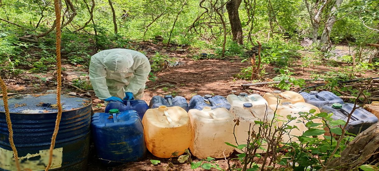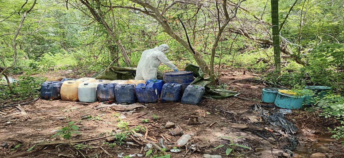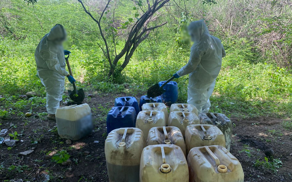 También en Culiacán, Sinaloa, en los poblados Corral Viejo, Agua Blanca y El Limoncito, elementos del Ejército Mexicano localizaron cuatro áreas de concentración de material diverso para la elaboración de metanfetamina, aseguraron 3,380 litros de sustancias químicas.