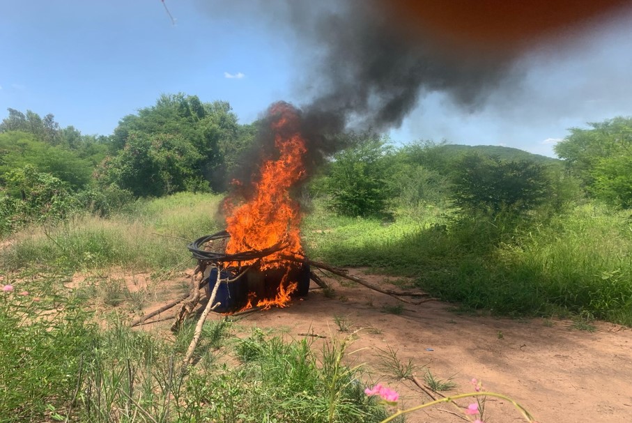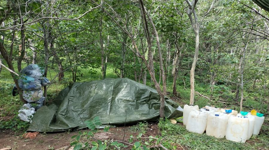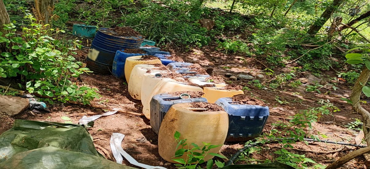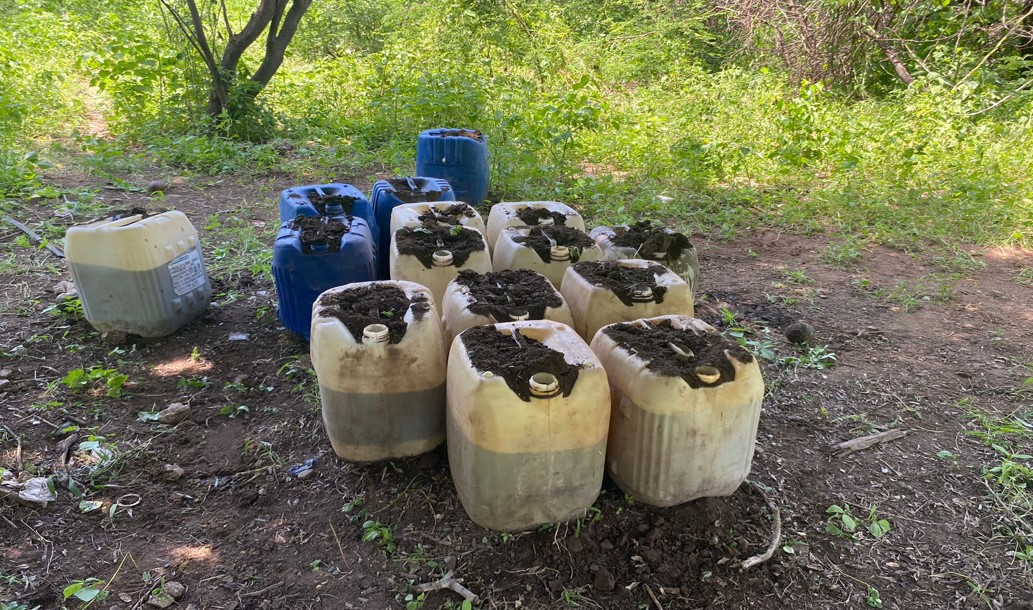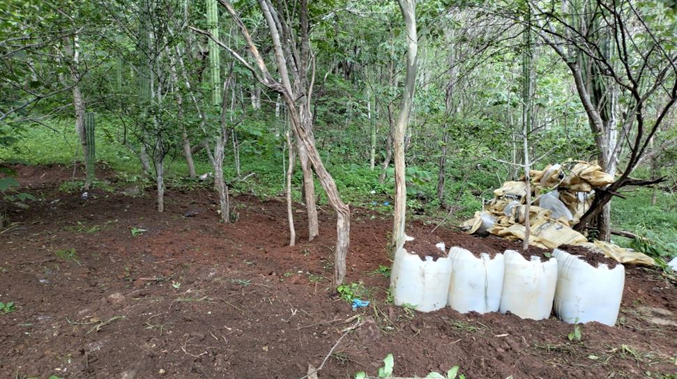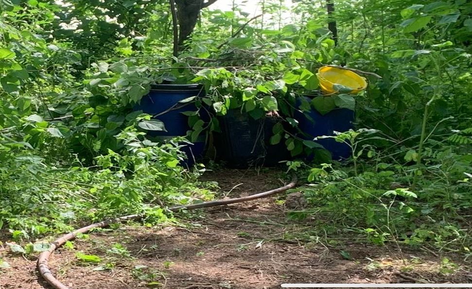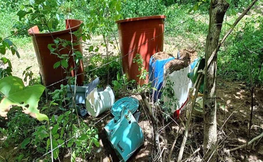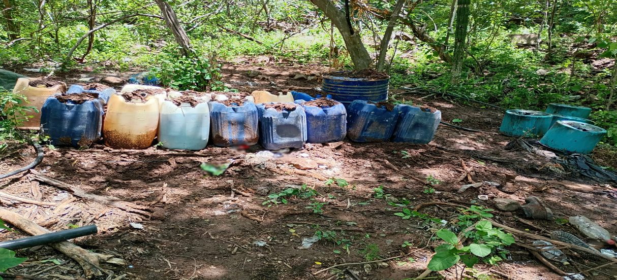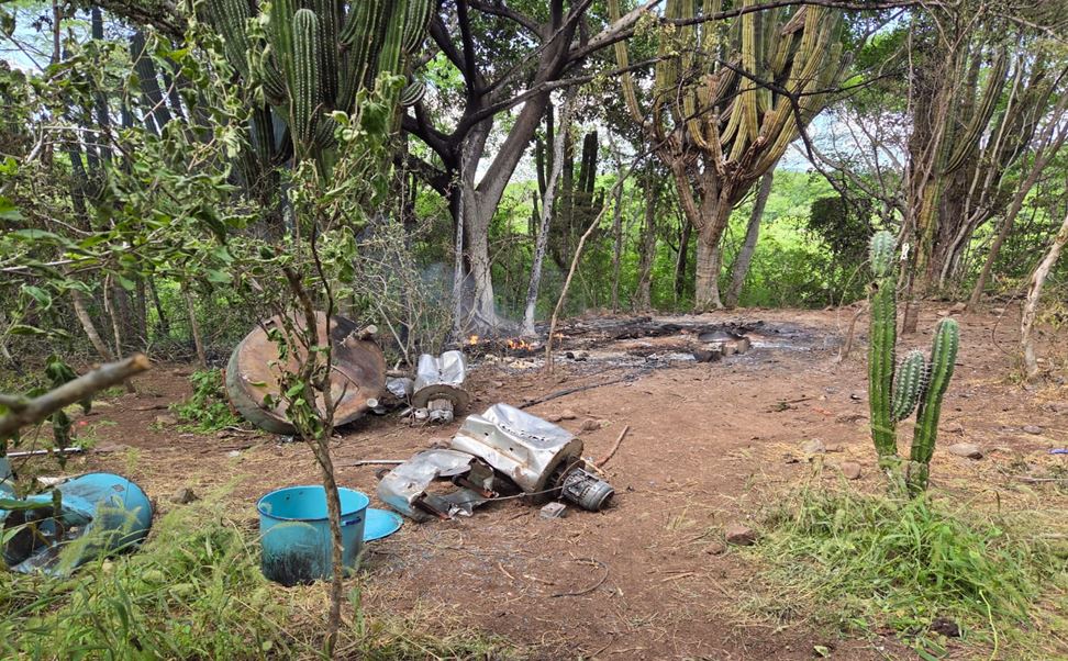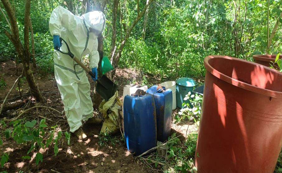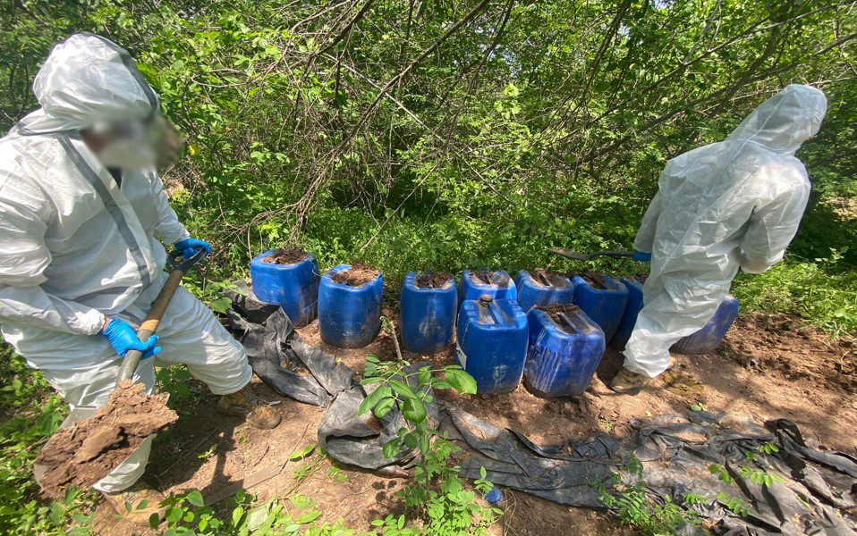 También en Culiacán, Sinaloa, en los poblados Corral Viejo, Agua Blanca y El Limoncito, elementos del Ejército Mexicano localizaron cuatro áreas de concentración de material diverso para la elaboración de metanfetamina, aseguraron 3,380 litros de sustancias químicas.