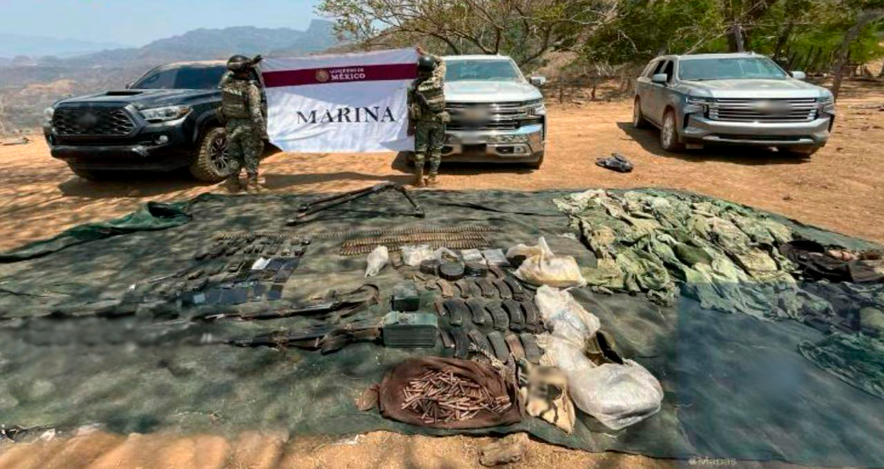 -En Ruiz, elementos de Semar aseguraron dos armas largas, 2,852 cartuchos útiles, 23 cargadores, tres chalecos tácticos, 19 uniformes tácticos, equipos de comunicaciones y tres vehículos abandonados.