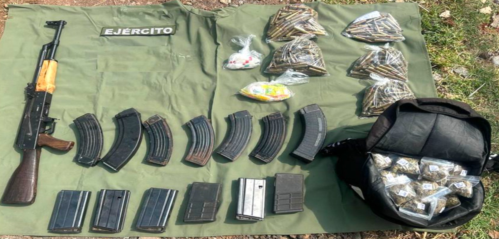 -En Elota, elementos del Ejército Mexicano aseguraron seis armas largas, un rifle de diábolos, cargadores, cartuchos, diversas dosis de marihuana y siete chalecos tácticos.