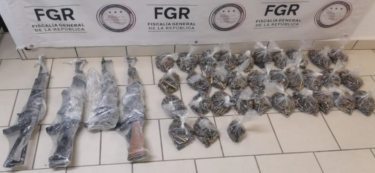 -En Cananea, elementos del Ejército Mexicano y FGR catearon un inmueble y aseguraron cuatro armas largas, 62 cargadores, 3,250 cartuchos, tres granadas, 160 kilos de marihuana, 27 chalecos tácticos y tres vehículos.
