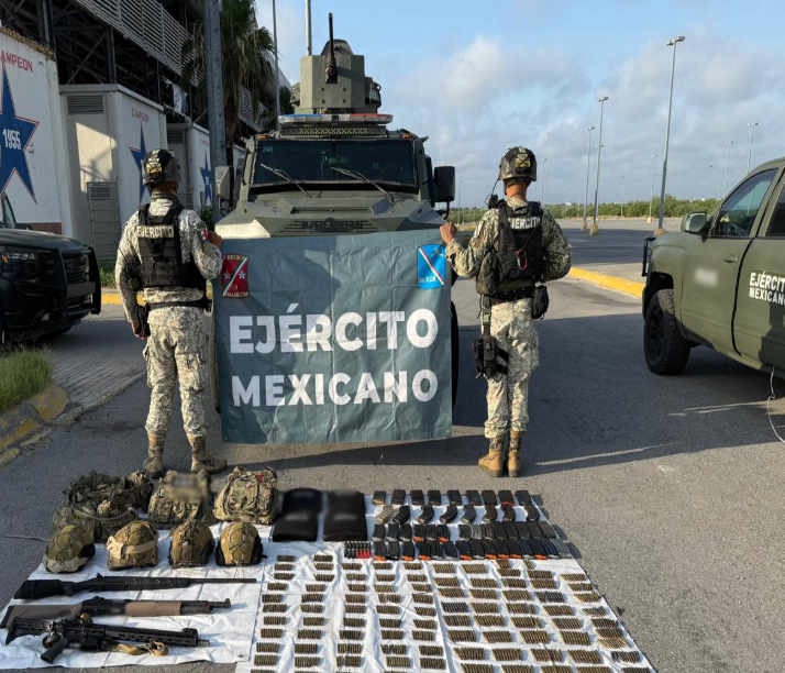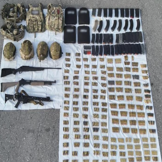 -En Nuevo Laredo, elementos del Ejército Mexicano en la carretera a Ciudad Anáhuac, localizaron una bolsa negra y una caja de cartón que contenía tres armas largas, 47 cargadores, 1,592 cartuchos, dos chalecos tácticos, cuatro placas balísticas y cuatro cascos balísticos.