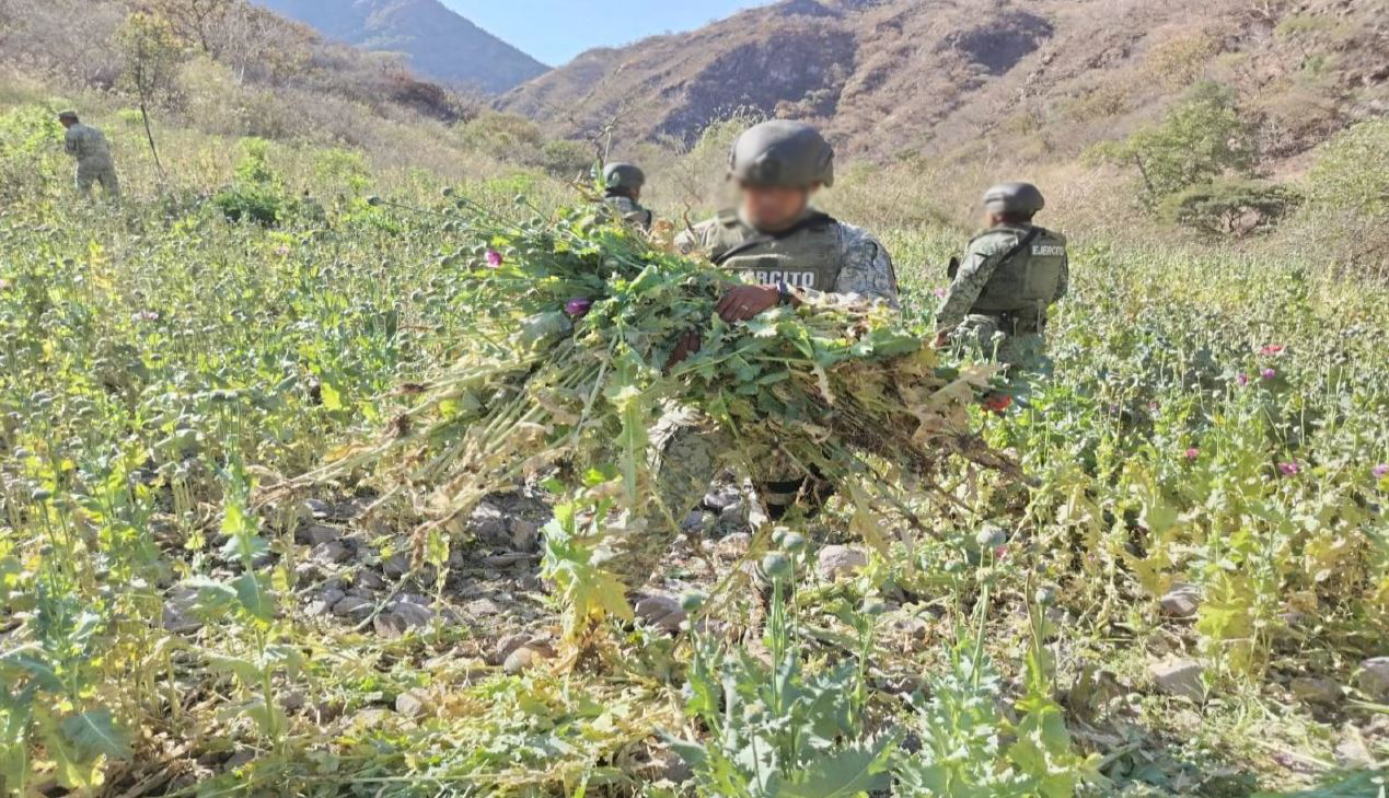 En Chihuahua, Sinaloa, Durango, Guerrero y Oaxaca, elementos del Ejército Mexicano, destruyeron 168 plantíos de amapola en ocho hectáreas y 44 plantíos de marihuana en cuatro hectáreas.