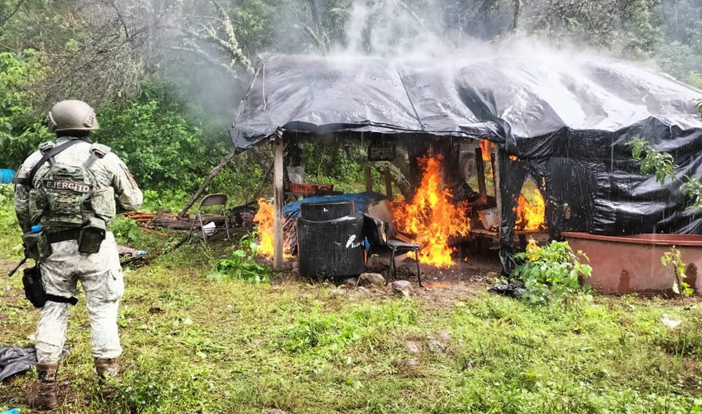 Culiacán y Cosalá, Sinaloa, en los poblados de La Nanchi, Las Tapias, Agua Caliente de los Monzón, San Antonio, Paredón Colorado y Baila, elementos del Ejército Mexicano localizaron seis áreas de concentración de material diverso para la elaboración de metanfetamina, aseguraron 1,520 litros de sustancias químicas, un reactor de síntesis orgánica y un condensador.