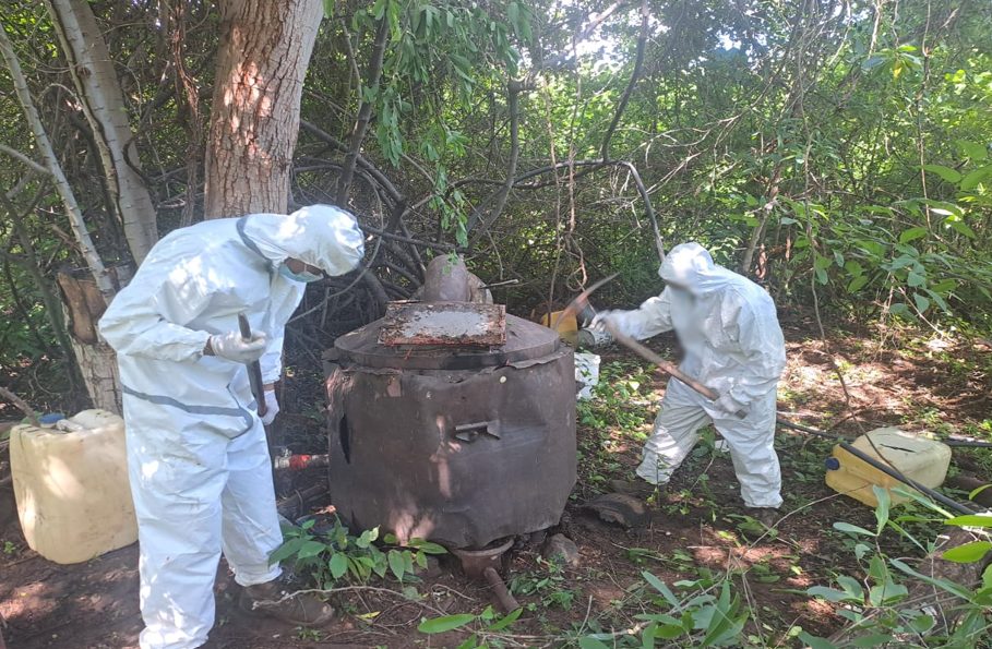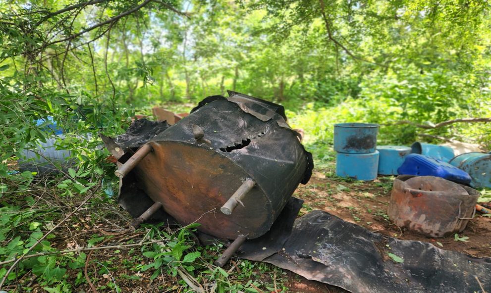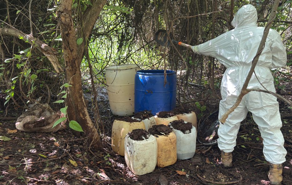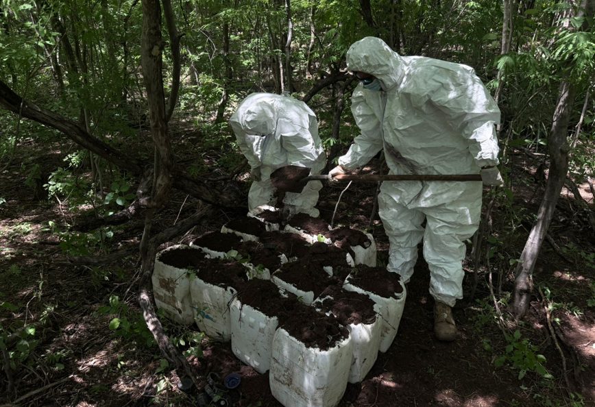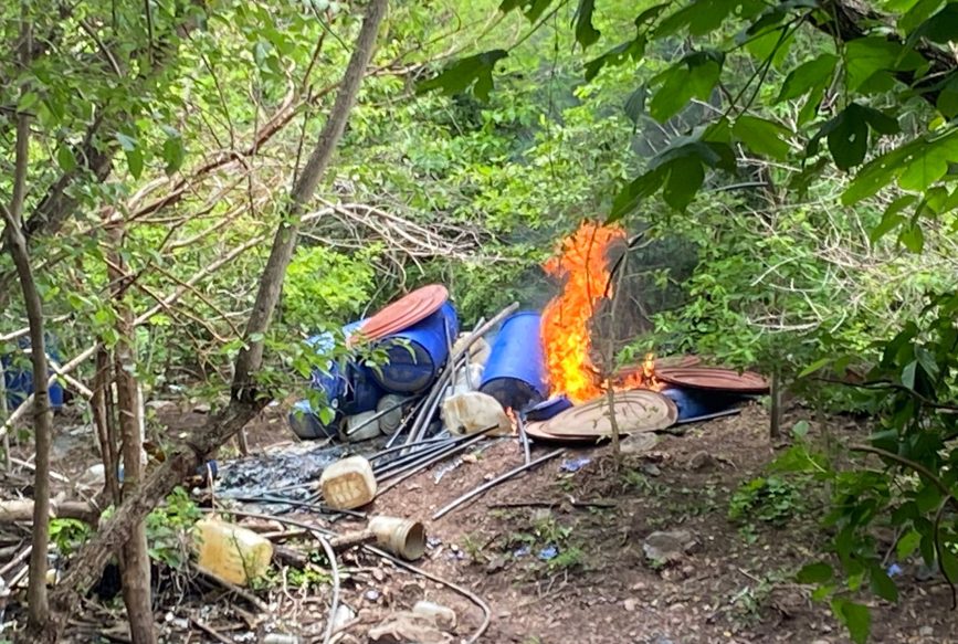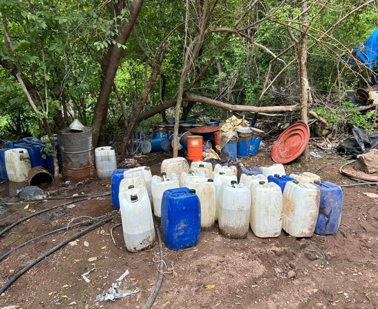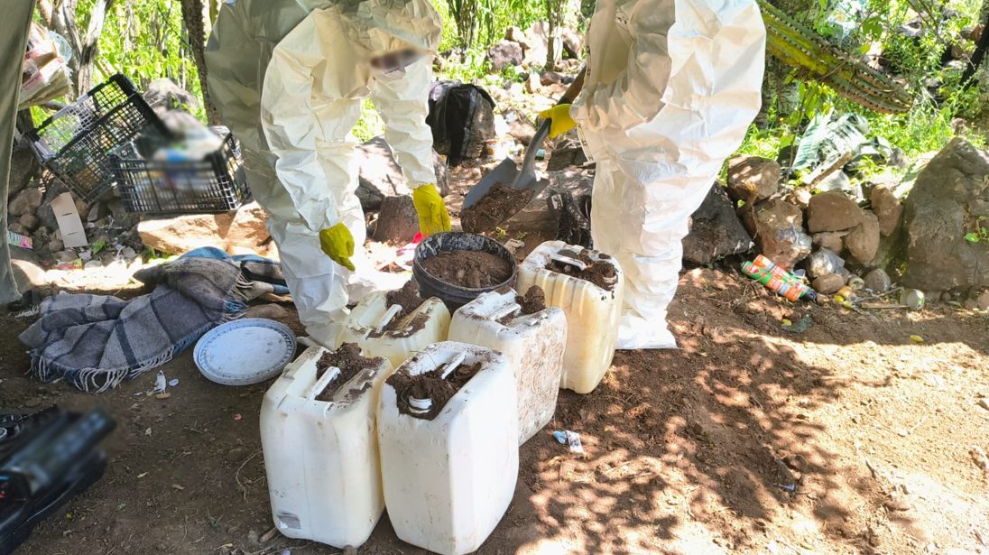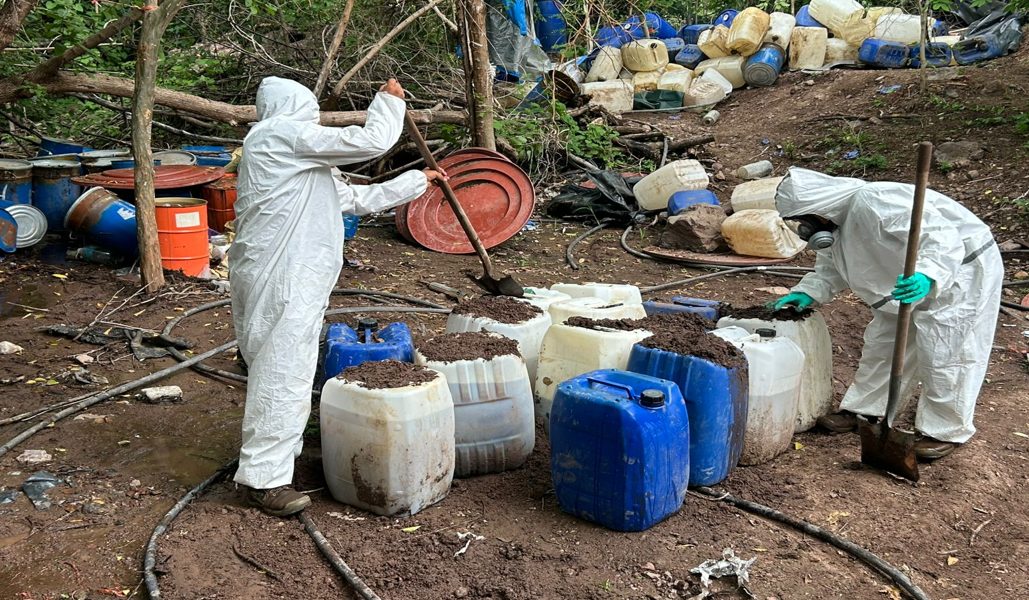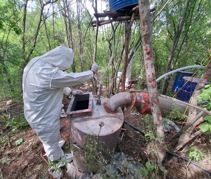 Culiacán y Cosalá, Sinaloa, en los poblados de La Nanchi, Las Tapias, Agua Caliente de los Monzón, San Antonio, Paredón Colorado y Baila, elementos del Ejército Mexicano localizaron seis áreas de concentración de material diverso para la elaboración de metanfetamina, aseguraron 1,520 litros de sustancias químicas, un reactor de síntesis orgánica y un condensador.