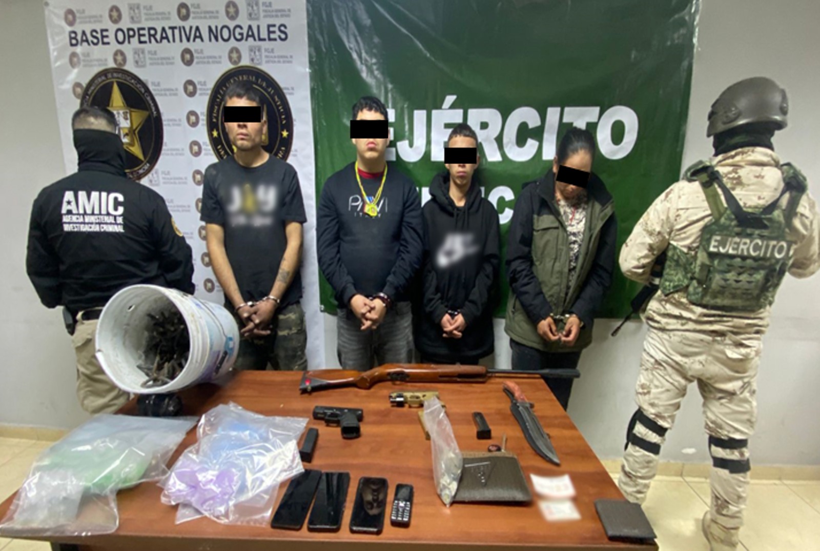 -En Nogales, elementos del Ejército Mexicano y Fiscalía del Estado detuvieron a cuatro personas a bordo de un vehículo con reporte de robo, les aseguraron un arma larga, dos armas cortas, diversas dosis de droga y estrellas ponchallantas.