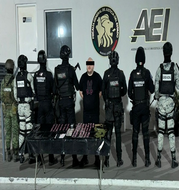 -En San Nicolás de los Garza, elementos del Ejército Mexicano, GN, Fiscalía del Estado y de la Policía Estatal detuvieron a una persona a bordo de un vehículo con reporte de robo y le aseguraron un arma corta, equipo táctico y diversas dosis de droga.