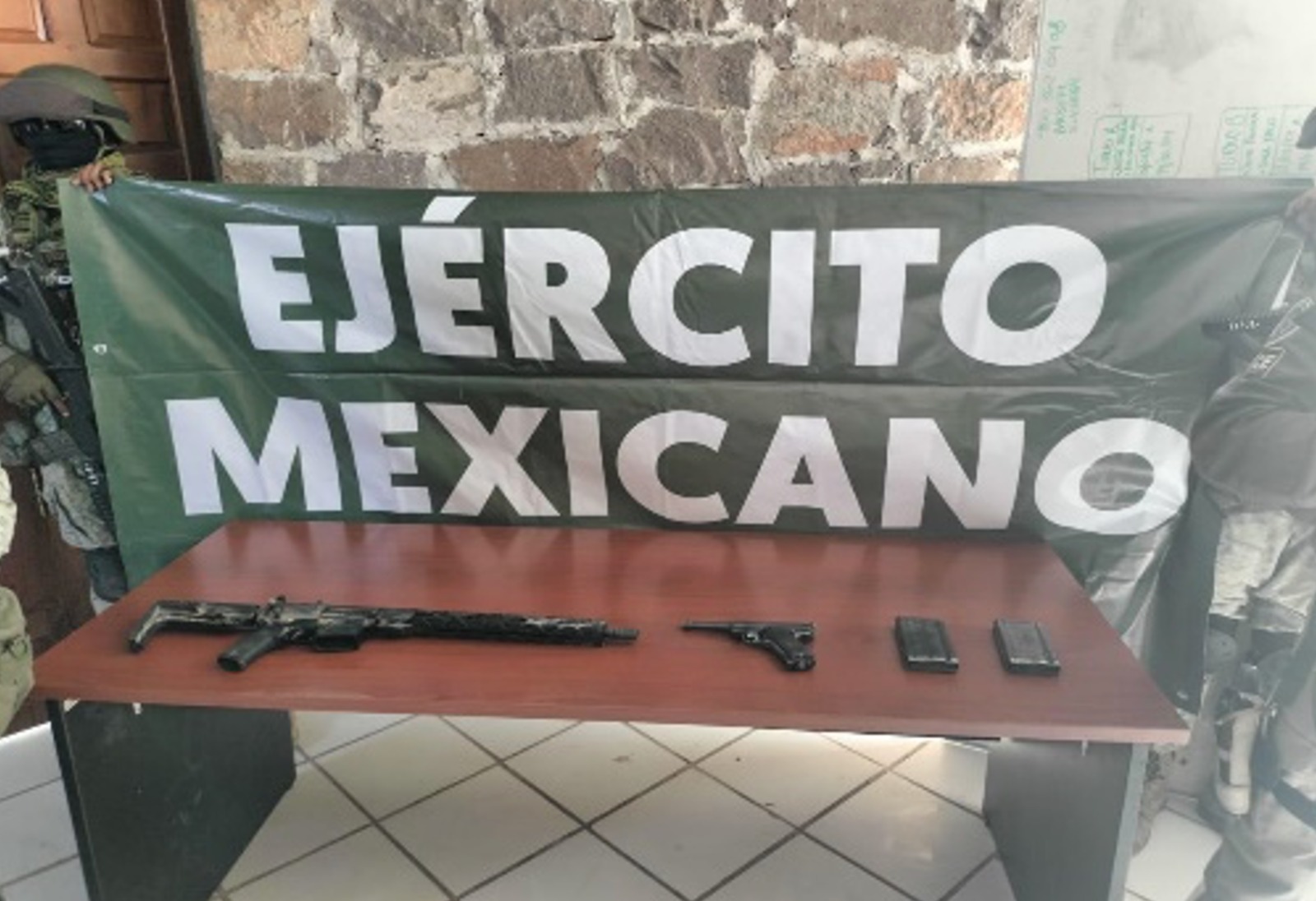 -En Rosario, en el poblado de Copalillos, elementos del Ejército Mexicano aseguraron dos armas de fuego, equipo táctico y un vehículo.