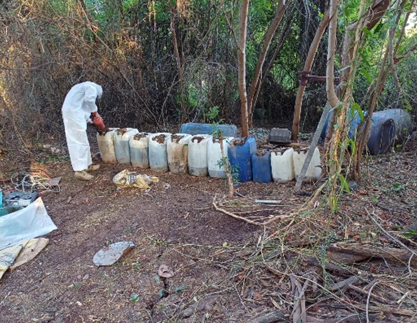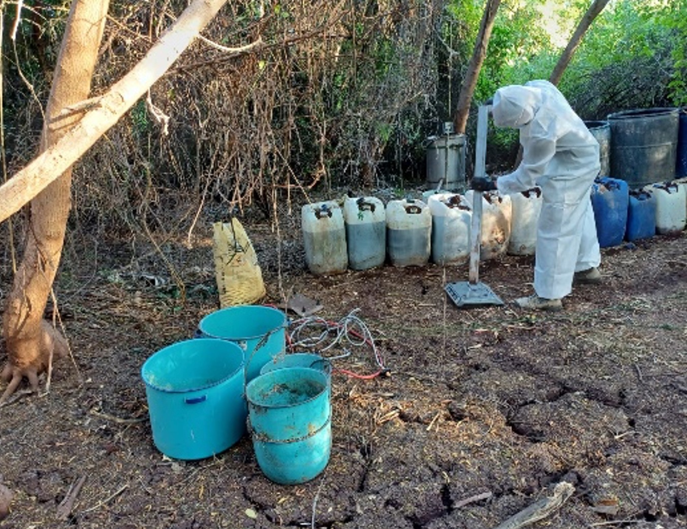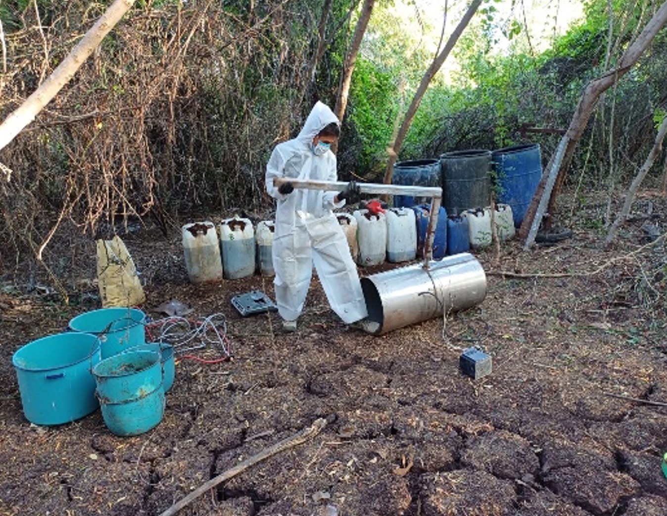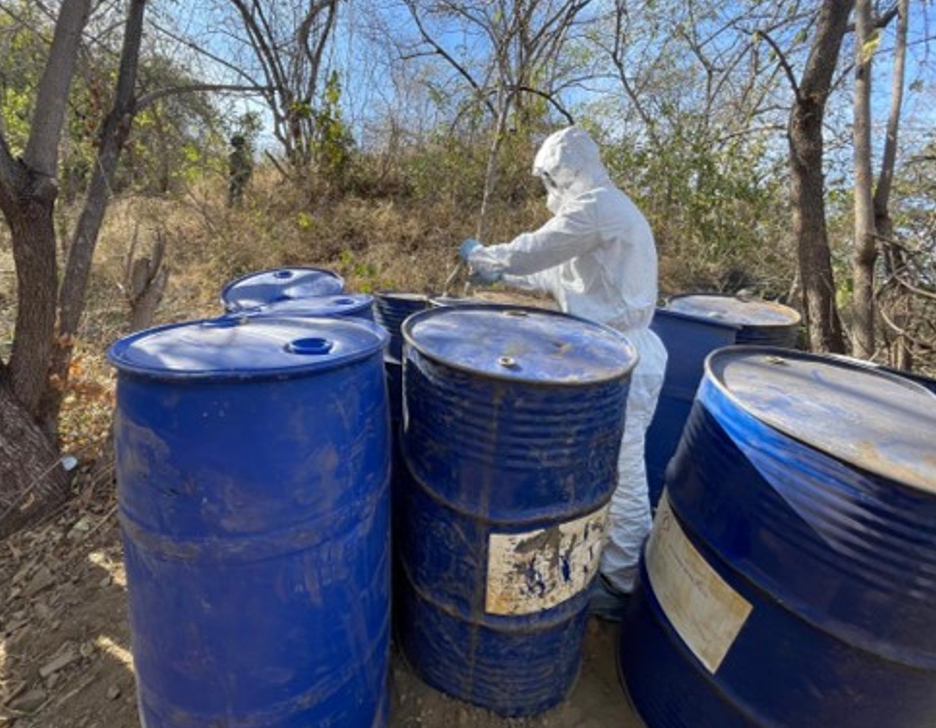 En Culiacán, elementos del Ejército Mexicano localizaron un laboratorio clandestino para la producción de metanfetamina, aseguraron tres áreas de material diverso, 10 mil 200 litros y 925 kilos de sustancias químicas, dos reactores de síntesis orgánica y cuatro condensadores.