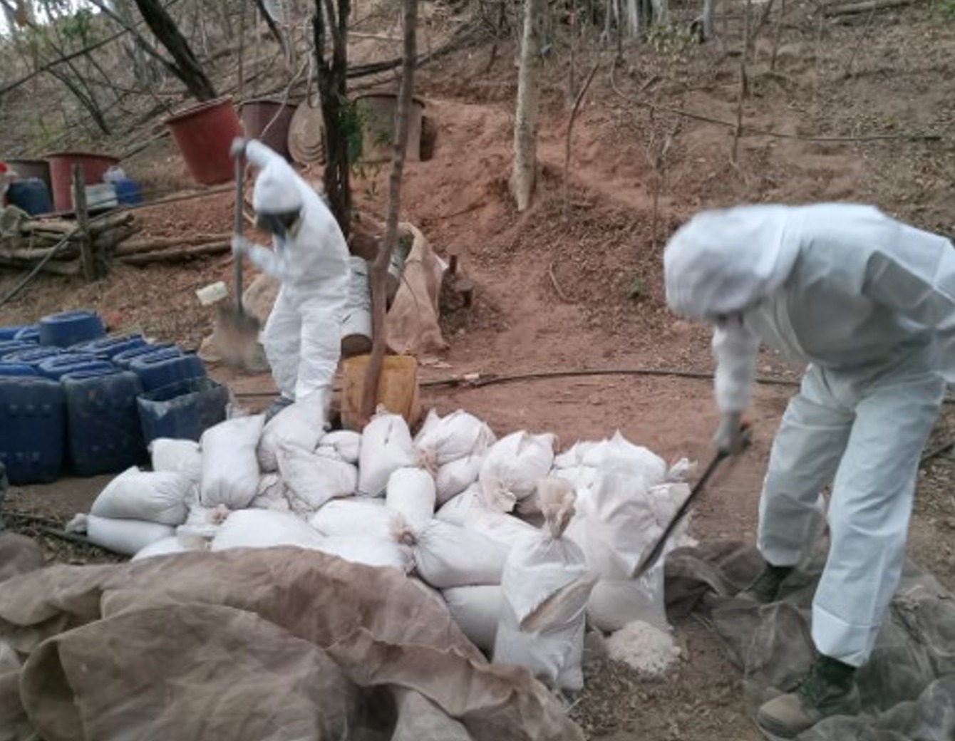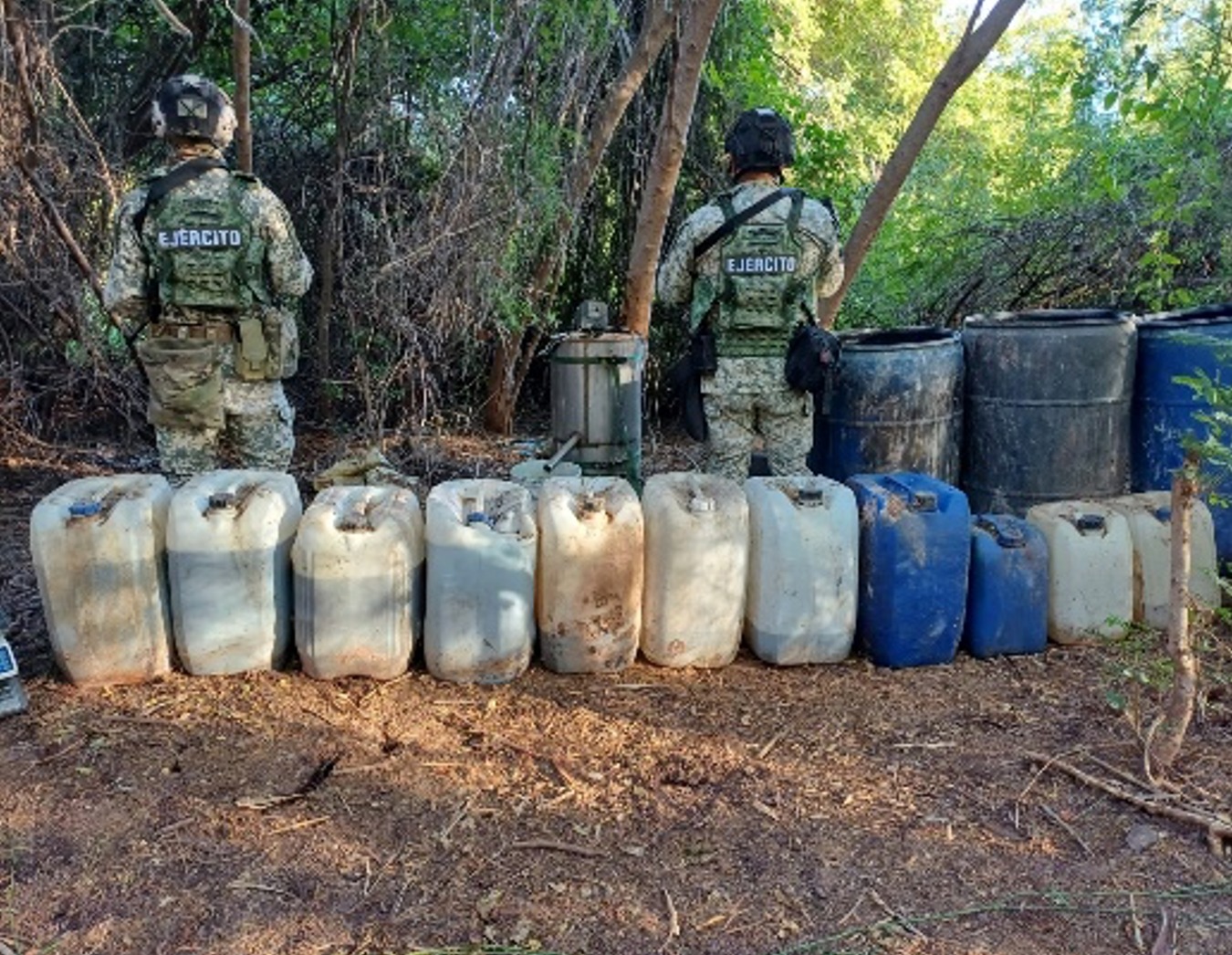 En Sinaloa, elementos del Ejército Mexicano localizaron un laboratorio para la producción de metanfetamina, aseguraron tres áreas de material diverso, 10 mil 200 litros y 925 kilos de sustancias químicas. La afectación económica a las organizaciones delictivas es de 1 mil 103 millones de pesos