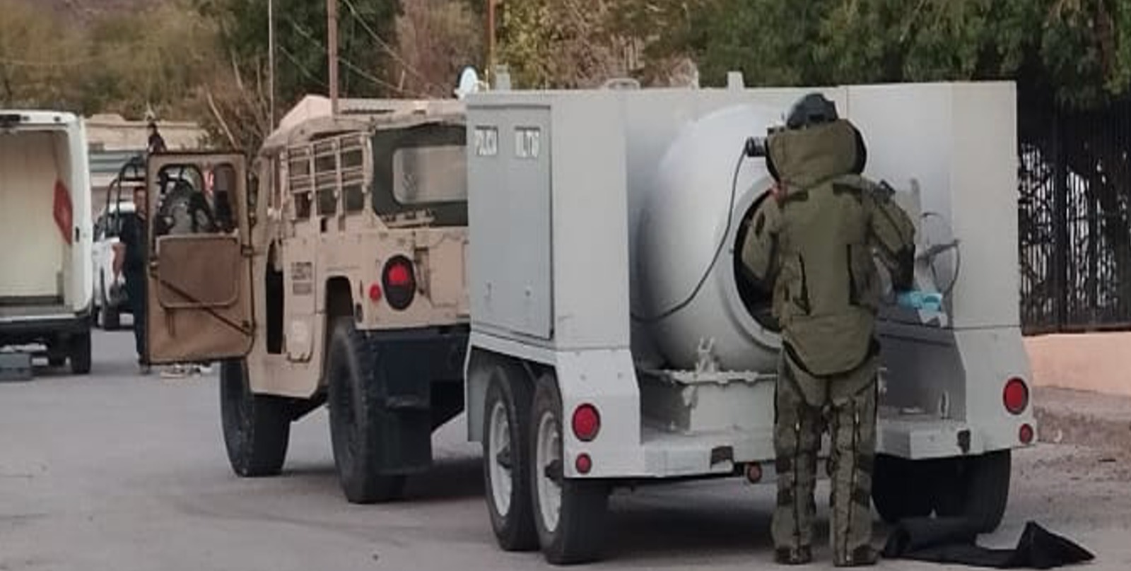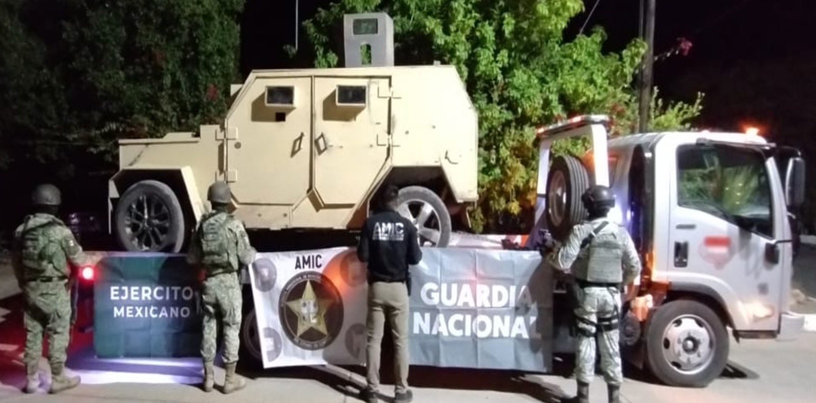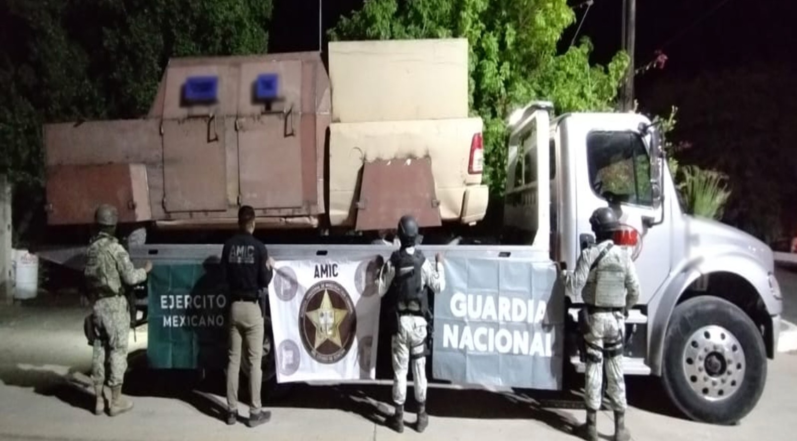 -En Pitiquito, elementos del Ejército Mexicano, GN y Fiscalía del Estado catearon un inmueble, asegurando dos vehículos con blindaje artesanal y con reporte de robo, un remolque de tráiler, cinco artefactos explosivos improvisados y material diverso para la elaboración de vehículos con blindaje artesanal.