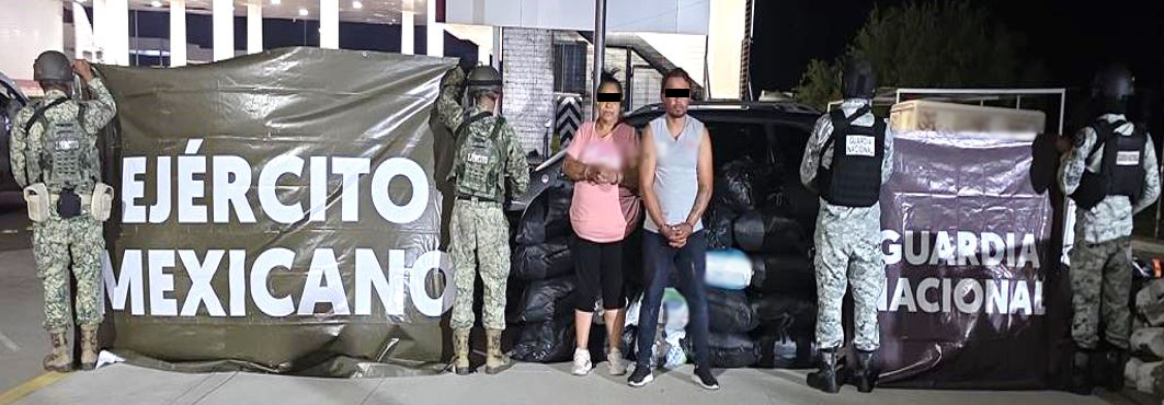 -En Tecate, elementos de la Guardia Nacional (GN) y Ejército Mexicano, en un puesto de seguridad, detuvieron a dos personas a bordo de un vehículo, les aseguraron 608 kilos de metanfetamina.
