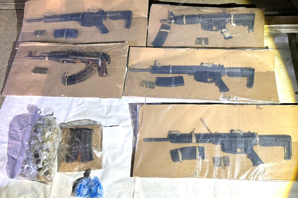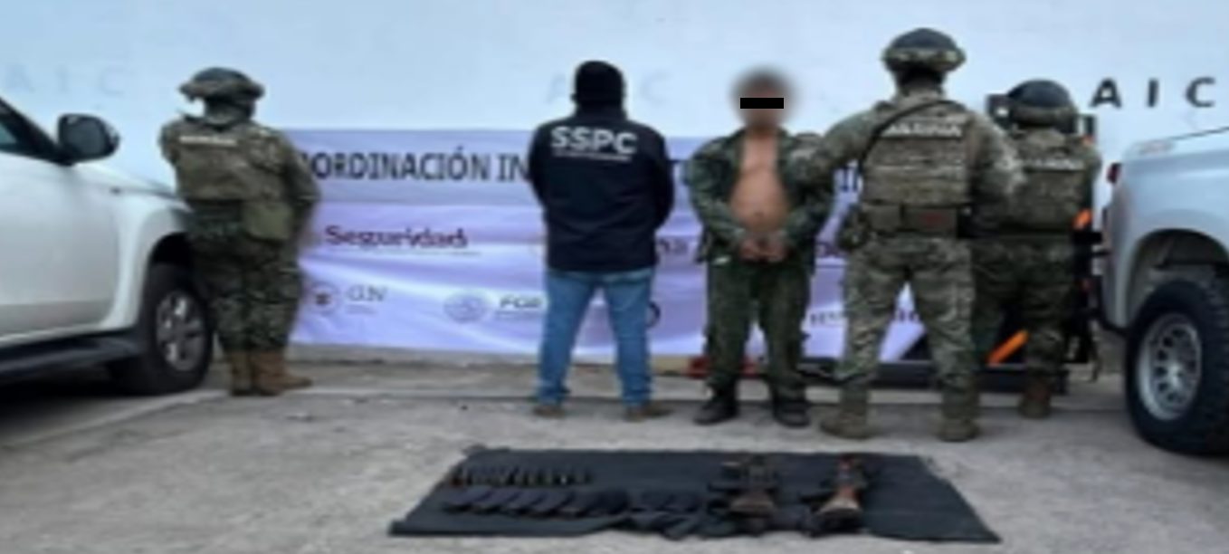 -En San Ignacio, elementos del Ejército Mexicano, Semar, GN, SSPC, FGR, Fiscalía y Policía Estatal detuvieron a dos personas, les aseguraron ocho armas largas, un arma corta, un tubo lanza-granadas, un rifle antidrón portátil, ocho granadas, 4,059 cartuchos y equipo táctico.
