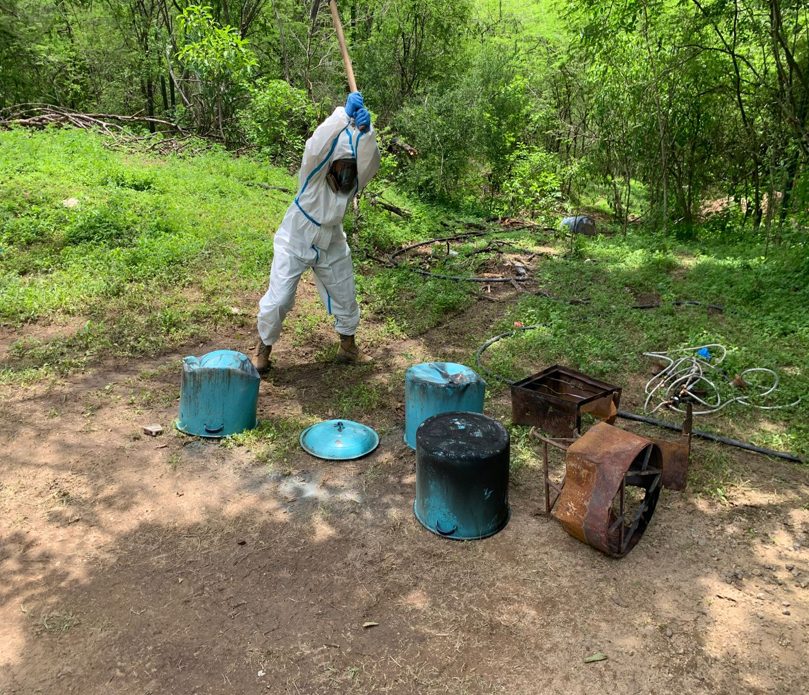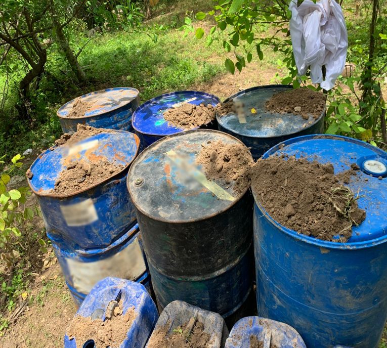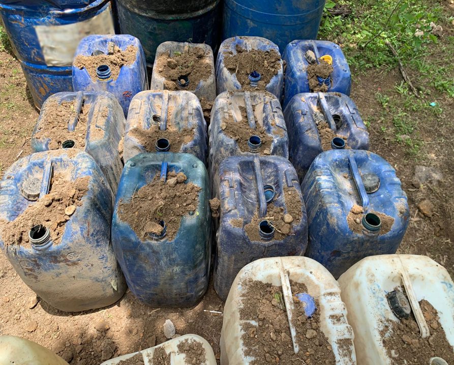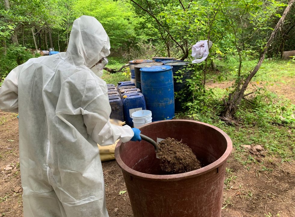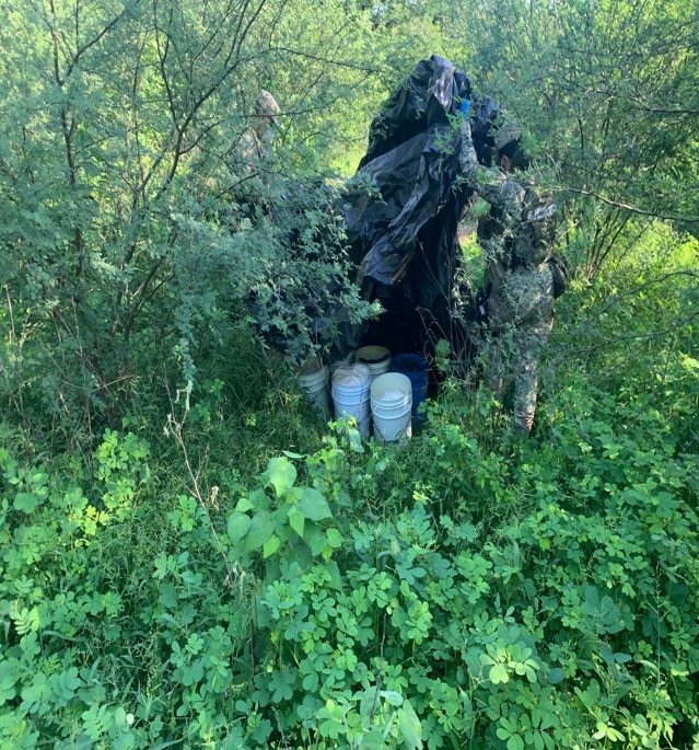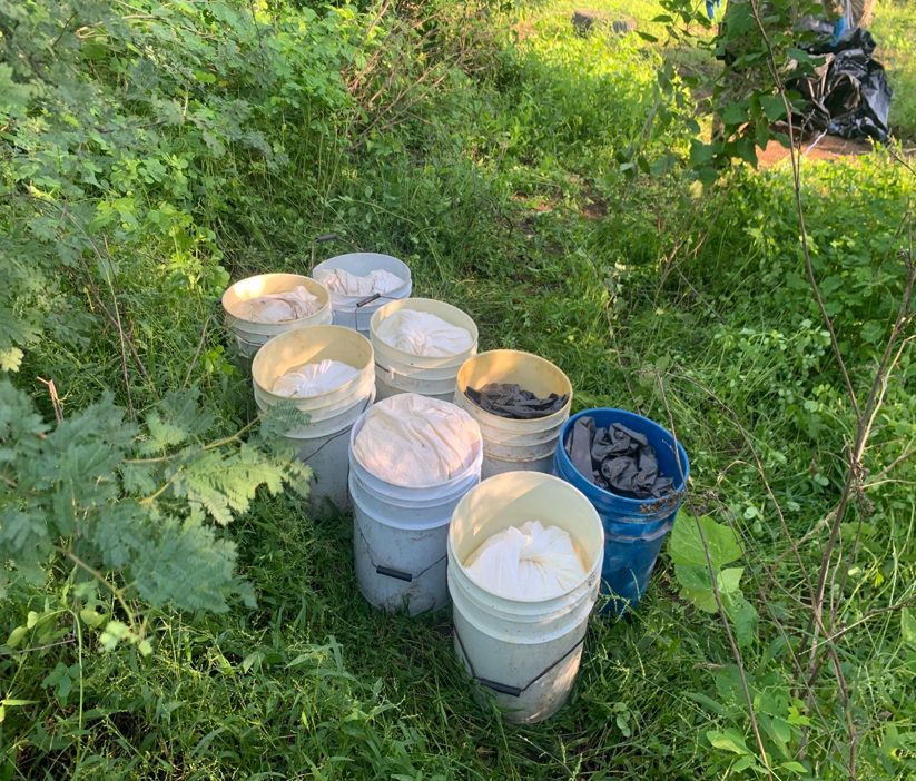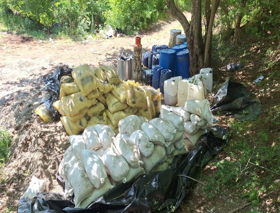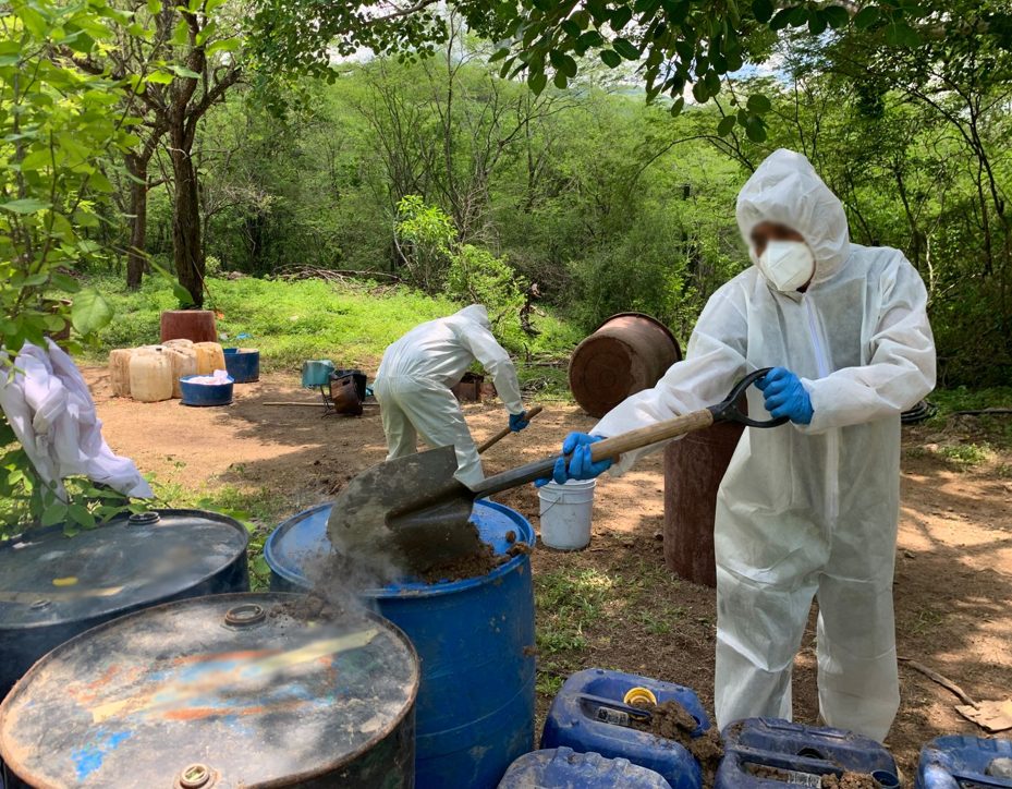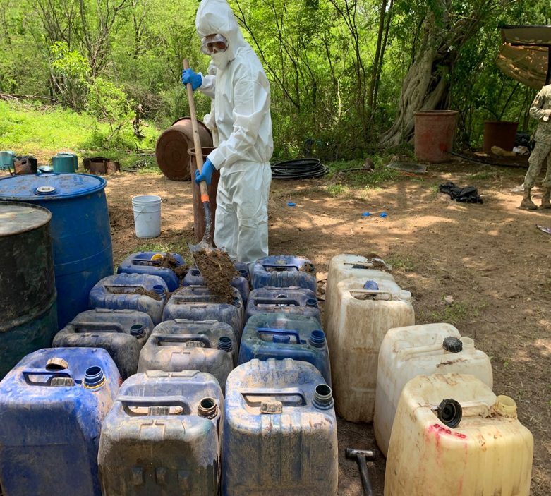En Culiacán, Sinaloa, en los poblados Corral Viejo, La Puerta, Presa Vinoramas y El Guayabo, elementos del Ejército Mexicano y GN localizaron seis áreas de concentración de material diverso, asegurando 5,030 litros y 4,537 kilos de sustancias químicas, un reactor de síntesis orgánica, un condensador, dos centrifugadoras y cuatro quemadores.
