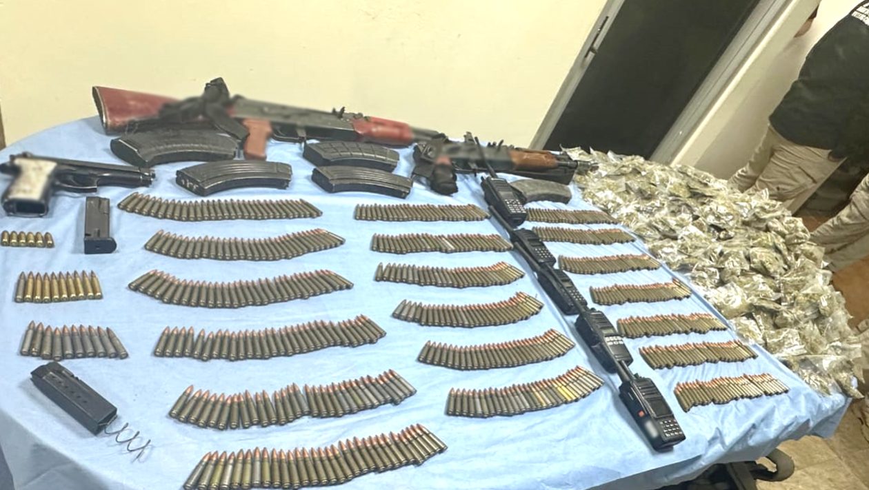 -En Tototlán, elementos del Ejército Mexicano y FGR catearon un inmueble, aseguraron nueve armas largas y cortas, 196 cartuchos, un kilo de marihuana, un vehículo y ropa tácticas.